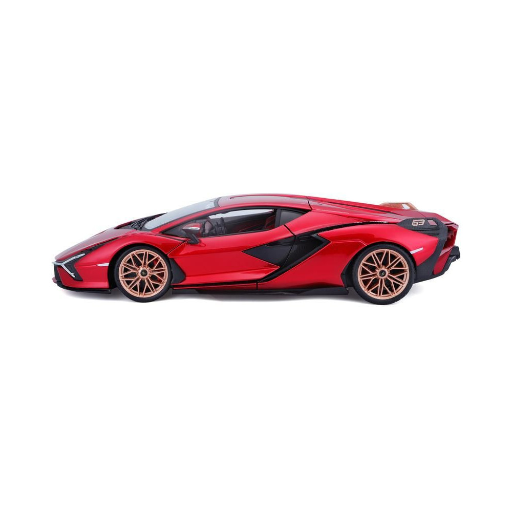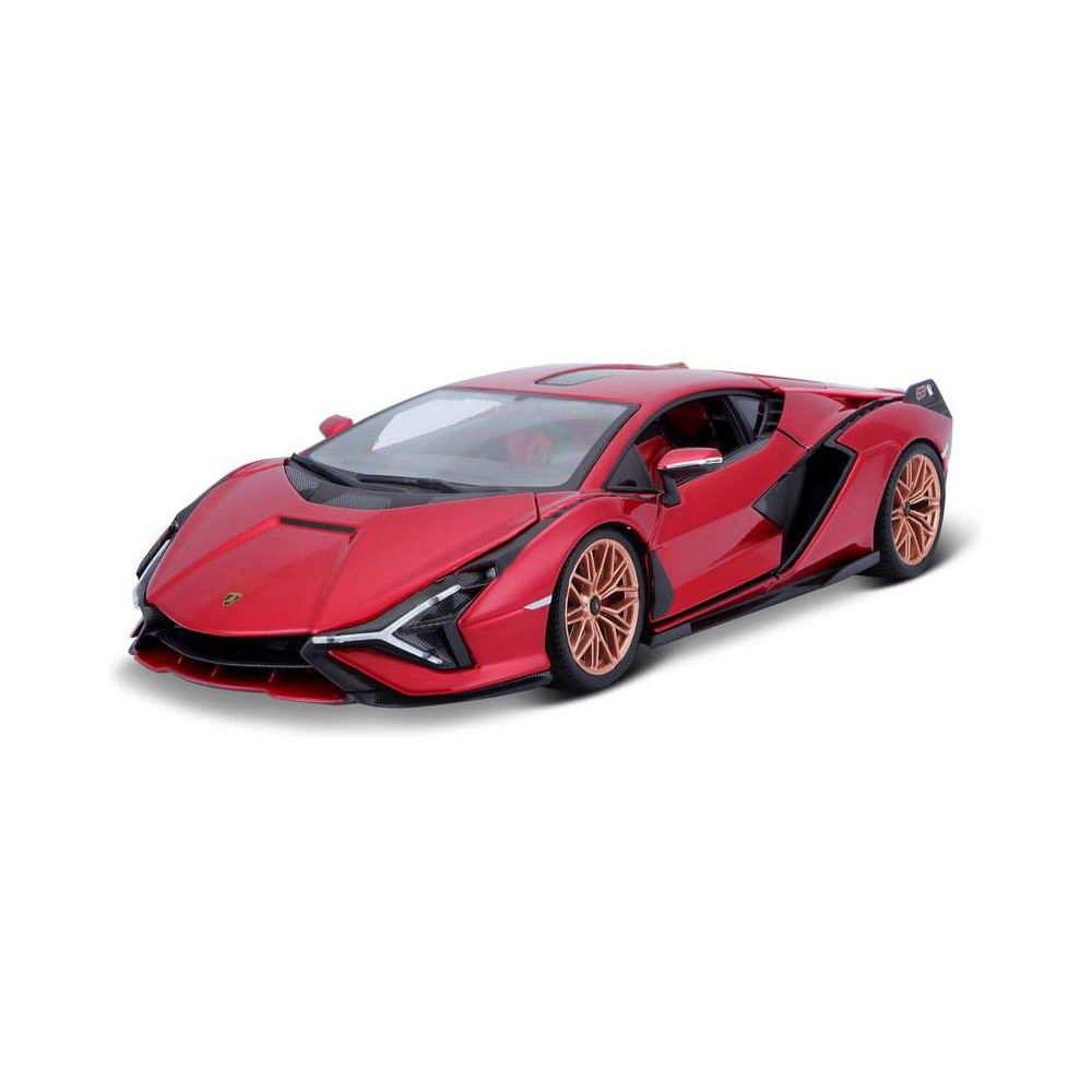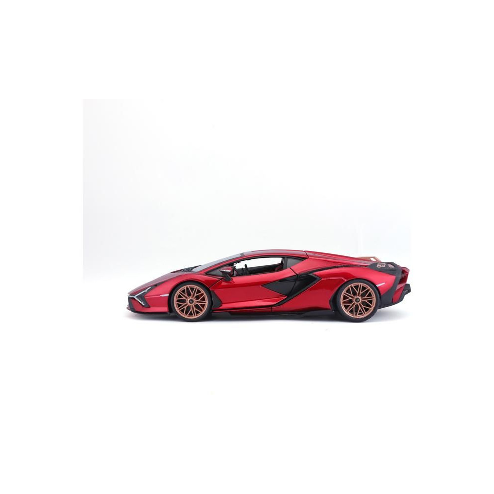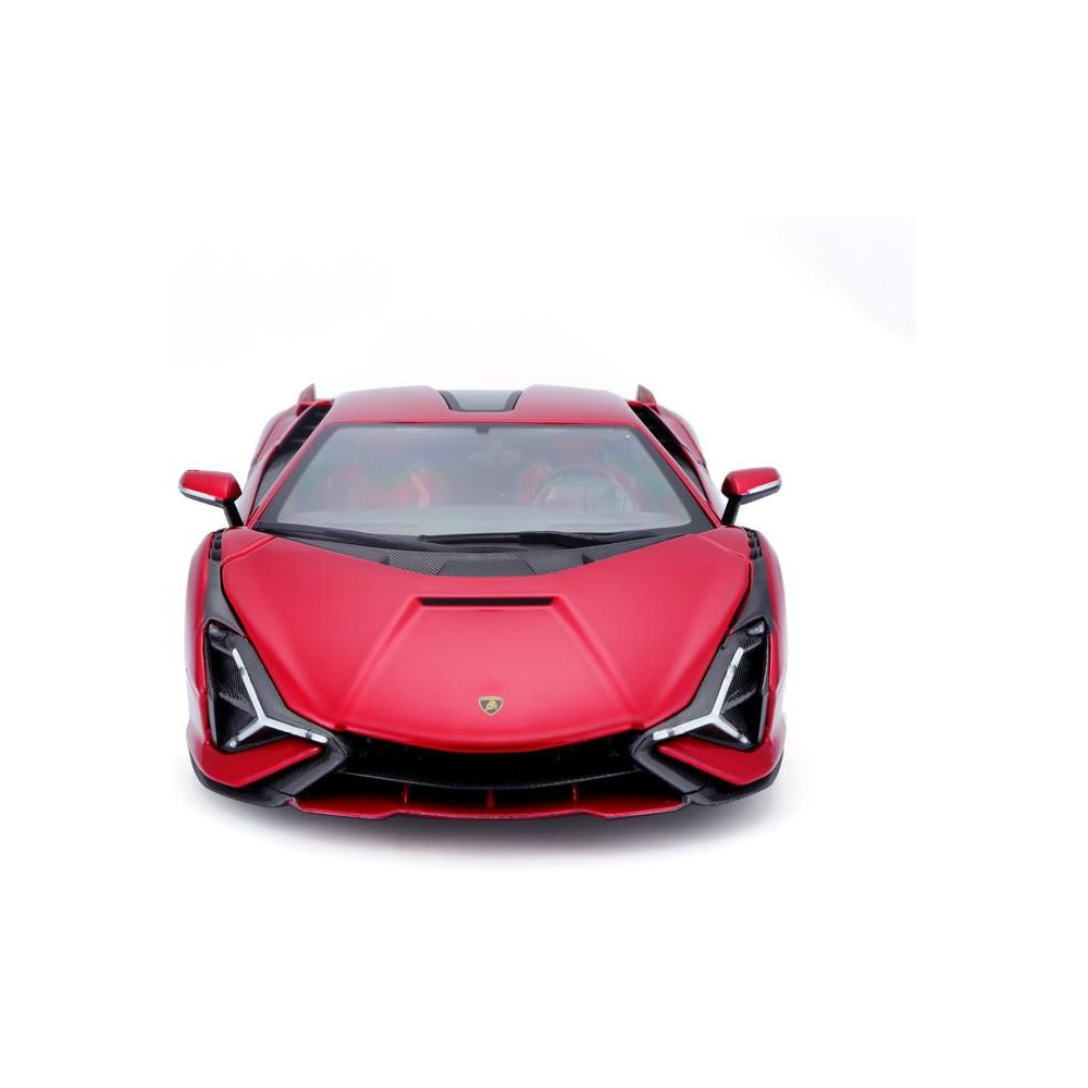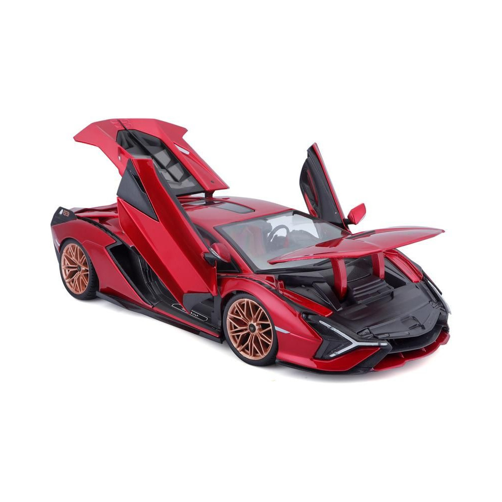 Fém autómodell 1:18 Bburago 18-11046 Lamborghini Sián FKP 37 nem csak gyűjtőknek. Nyitható ajtókkal és motorháztetővel rendelkezik, a kormánykerék teljesen működőképes. A modell színe piros, mérete kb. 24 cm.