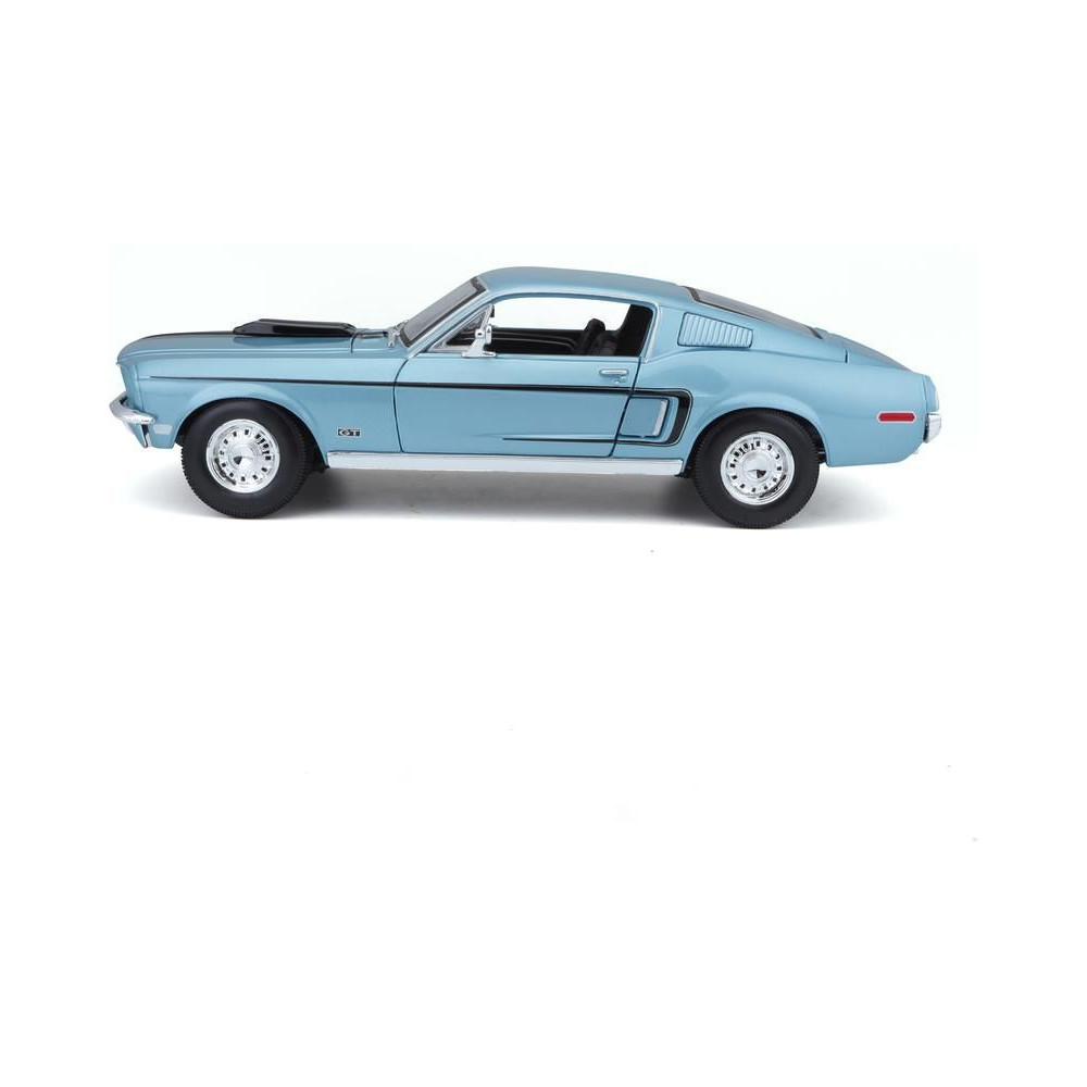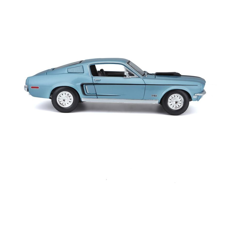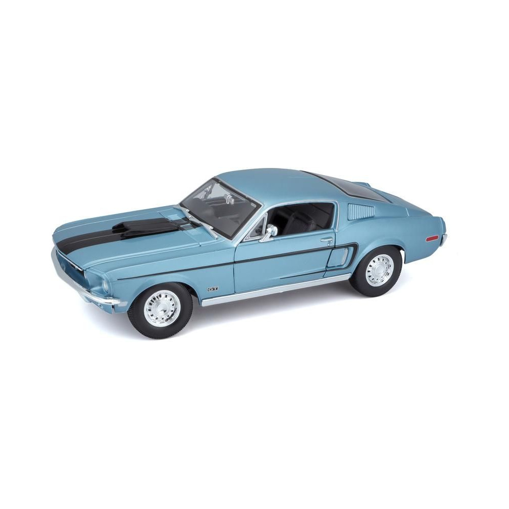 Fém autómodell 1:18 Maisto 31167 Ford Mustang GT Cobra Jet FB 1968 nem csak gyűjtőknek. A modell részletes kivitelben, műanyag alapon. A modell színe metálkék, mérete kb. 27 cm.