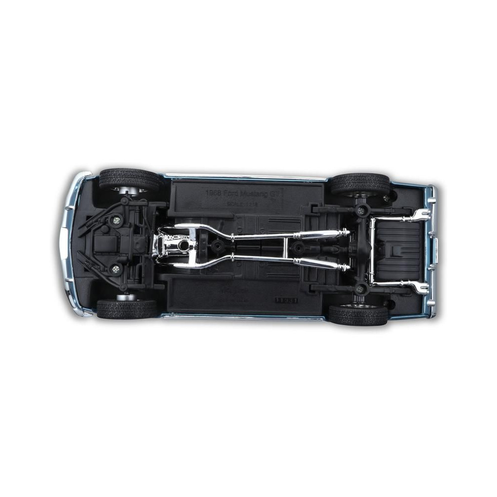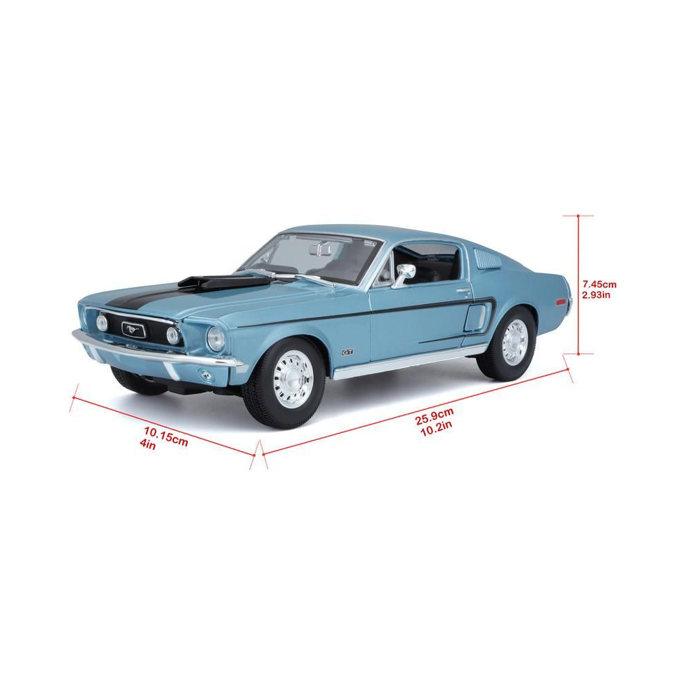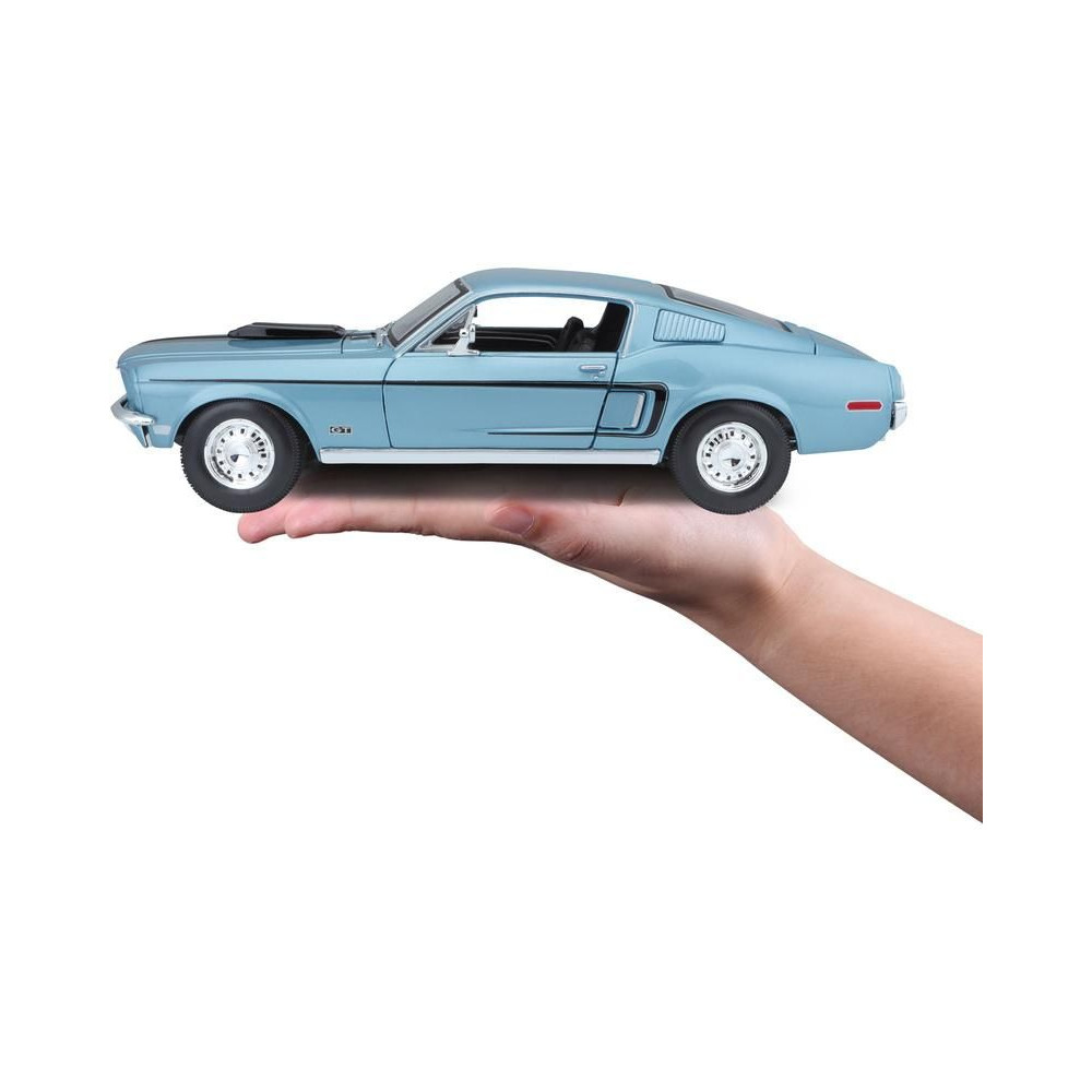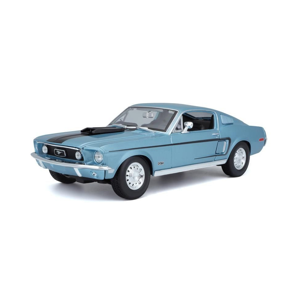 Fém autómodell 1:18 Maisto 31167 Ford Mustang GT Cobra Jet FB 1968 nem csak gyűjtőknek. A modell részletes kivitelben, műanyag alapon. A modell színe metálkék, mérete kb. 27 cm.