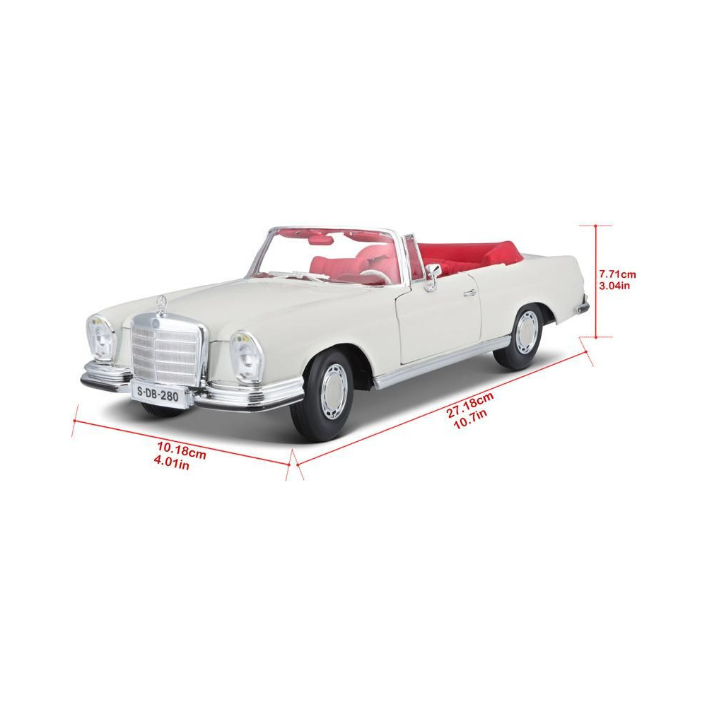Fém autómodell 1:18 Maisto 31811 Mercedes-Benz 280SE Cabrio 1967 nem csak gyűjtőknek. A modell részletes kivitelben, műanyag alapon. A modell színe krémszínű, mérete kb. 27 cm.