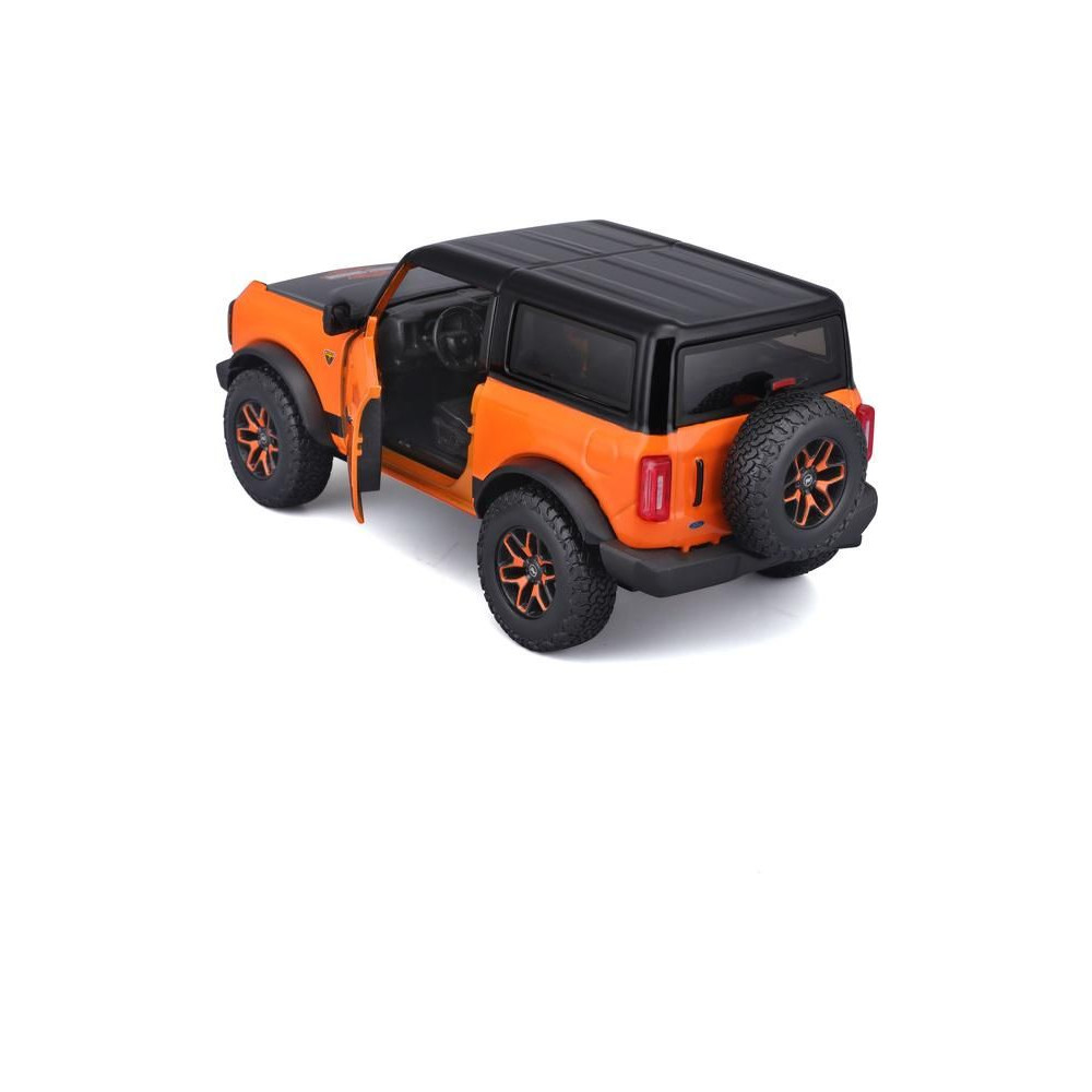 Fém autómodell 1:24 Maisto 32272 Ford Bronco 2021 nem csak gyűjtőknek. A modell részletes kivitelben készült és nyitható ajtókkal rendelkezik. A modell színe narancssárga, és körülbelül 17 cm nagy.