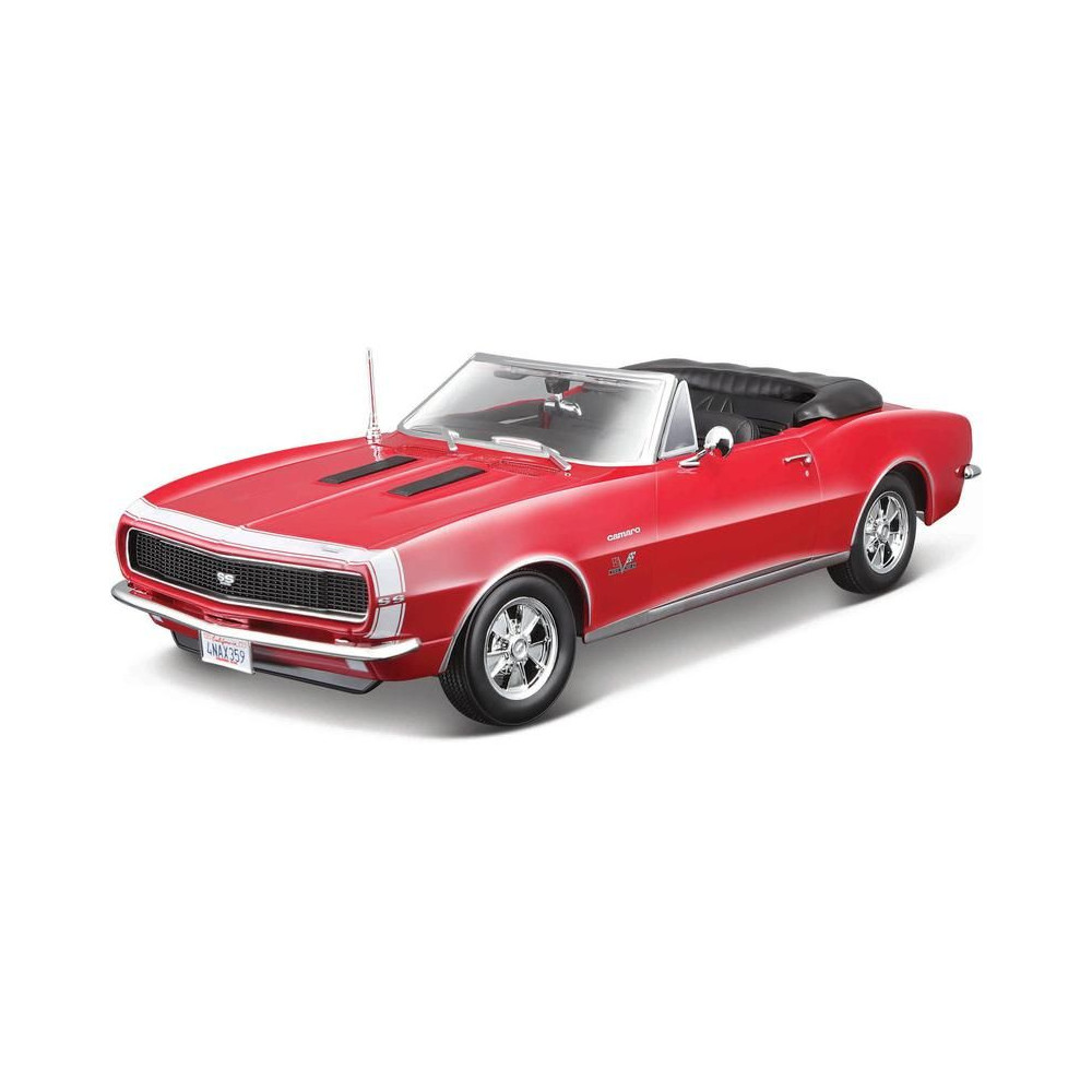Fém autómodell 1:18 Maisto 31684R Chevrolet Camaro SS 396 Convertible 1967, nem csak gyűjtőknek. A modell összecsukható, részletesen kidolgozott és nyitható ajtókkal rendelkezik. A modell színe piros, és körülbelül 25,5 cm hosszú A modell a kerekekkel el tudja fordítani a kormányt, kinyithatja az ajtókat, a motort és a csomagtérfedelet.