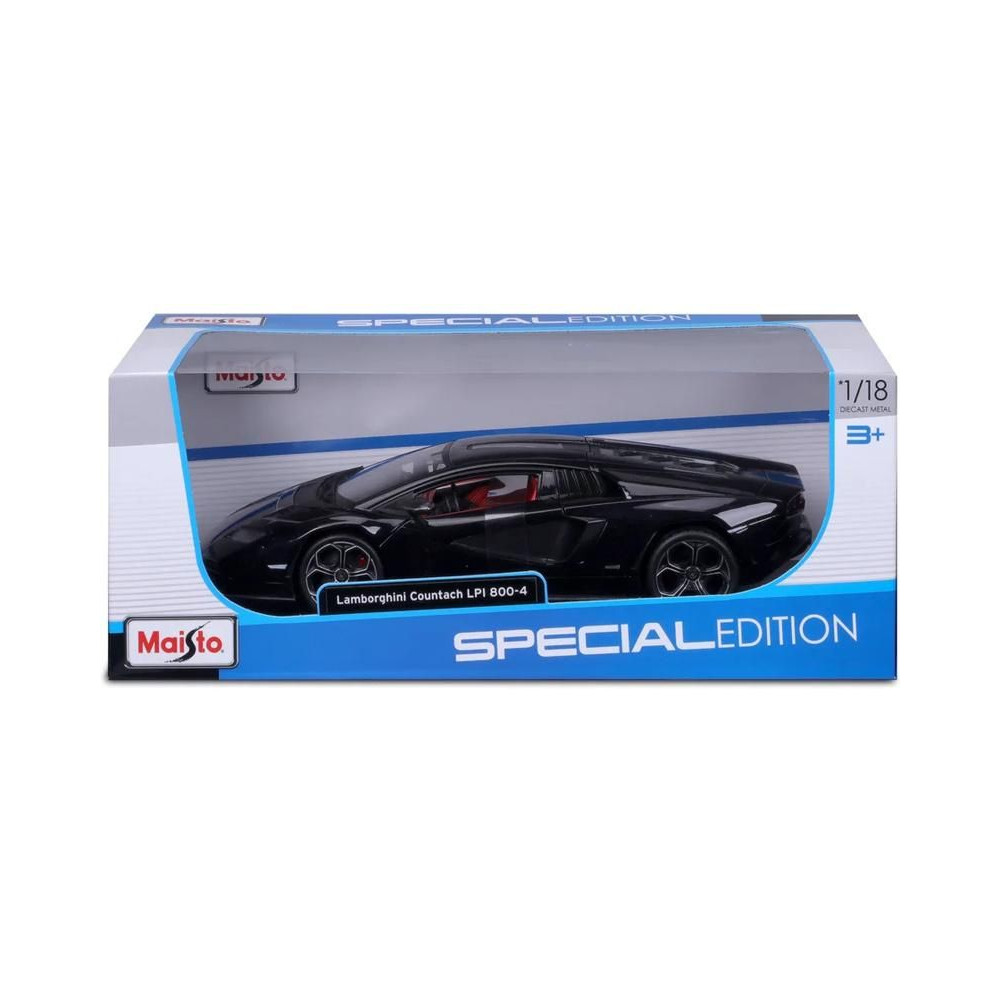 1:18-as Maisto 31459W Lamborghini Countach LPI 800-4 fém autómodell, nem csak gyűjtőknek. A modell részletesen kidolgozott és nyitható ajtóval rendelkezik. A modell színe fekete metálfényű és körülbelül 27 cm magas.