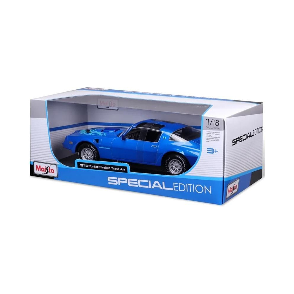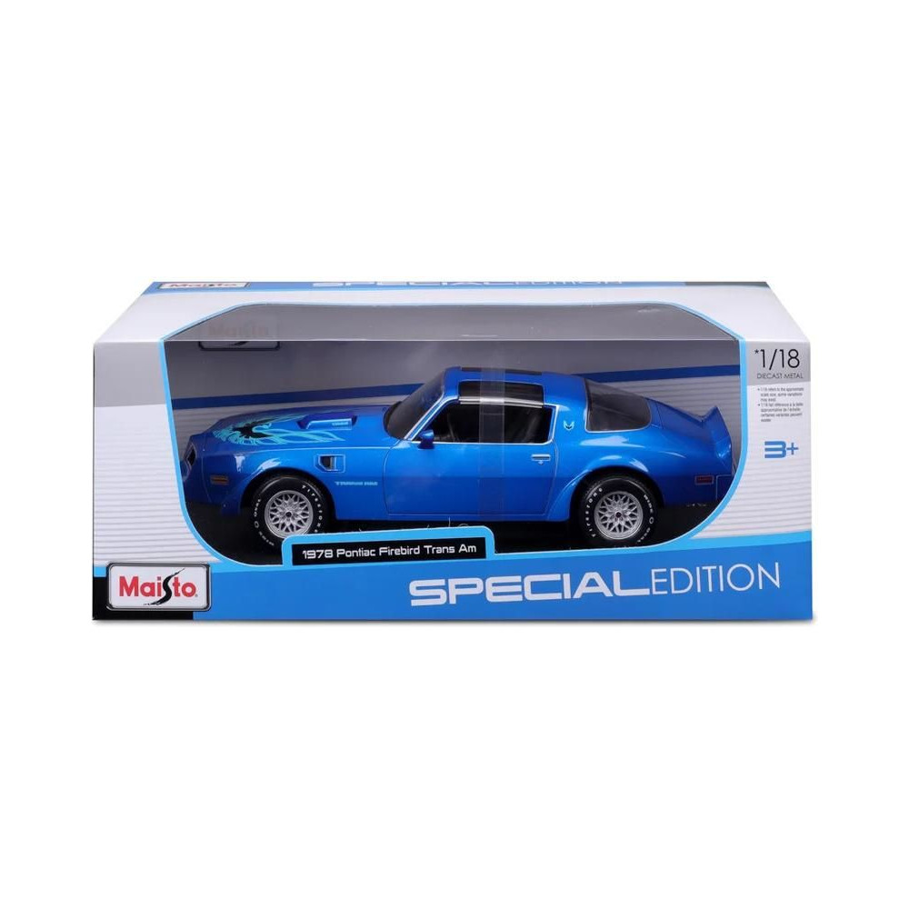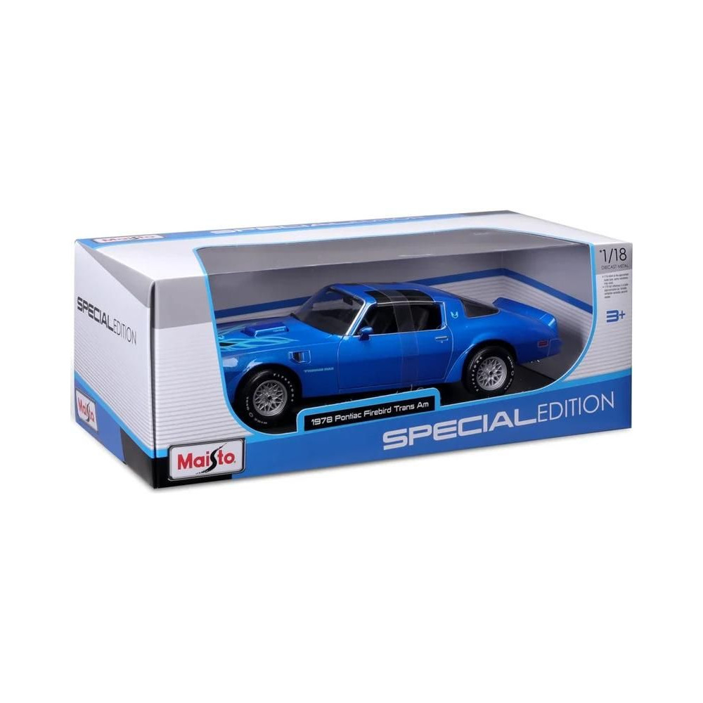 1:18-as Maisto 31464B Pontiac Firebird Trans AM 1978 fém autómodell, nem csak gyűjtőknek. A modell részletesen kidolgozott és nyitható ajtóval rendelkezik. A modell színe kék metálfényű és körülbelül 27 cm magas.