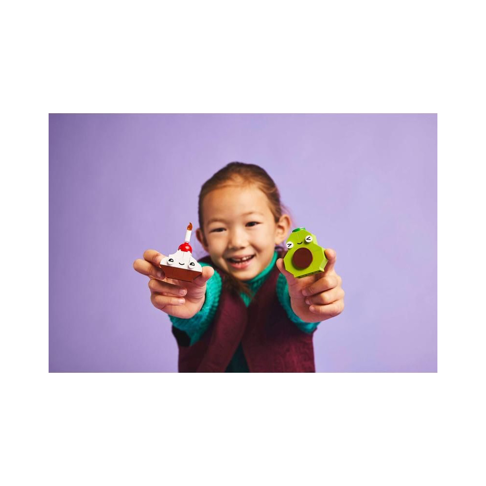 Élénk színű és figyelemfelkeltő kockák, valamint különleges darabok, például szemek, szájak és számos díszítőelem felhasználásával a gyerekek 4 aranyos játékot építhetnek a Kreatív Étel készletből: Cupcake-et, fagylaltot, avokádót és tacót. A kreatív móka folytatódik, miközben a gyerekek összekeverik a kockákat és átrendezik a modelleket szórócukorral megszórt torta, buboréktea, körte és panini formájában. Amikor a gyerekek önbizalmukra tesznek szert építés közben, az intuitív építési utasításoknak megfelelően megváltoztathatják arckifejezéseiket, formáikat vagy színeiket, és új barátokat is összeállíthatnak: zöld fagylaltot, egy doboz gyümölcslevet, egy darab görögdinnyét, egy tábla csokoládét és egy mega szendvicset.