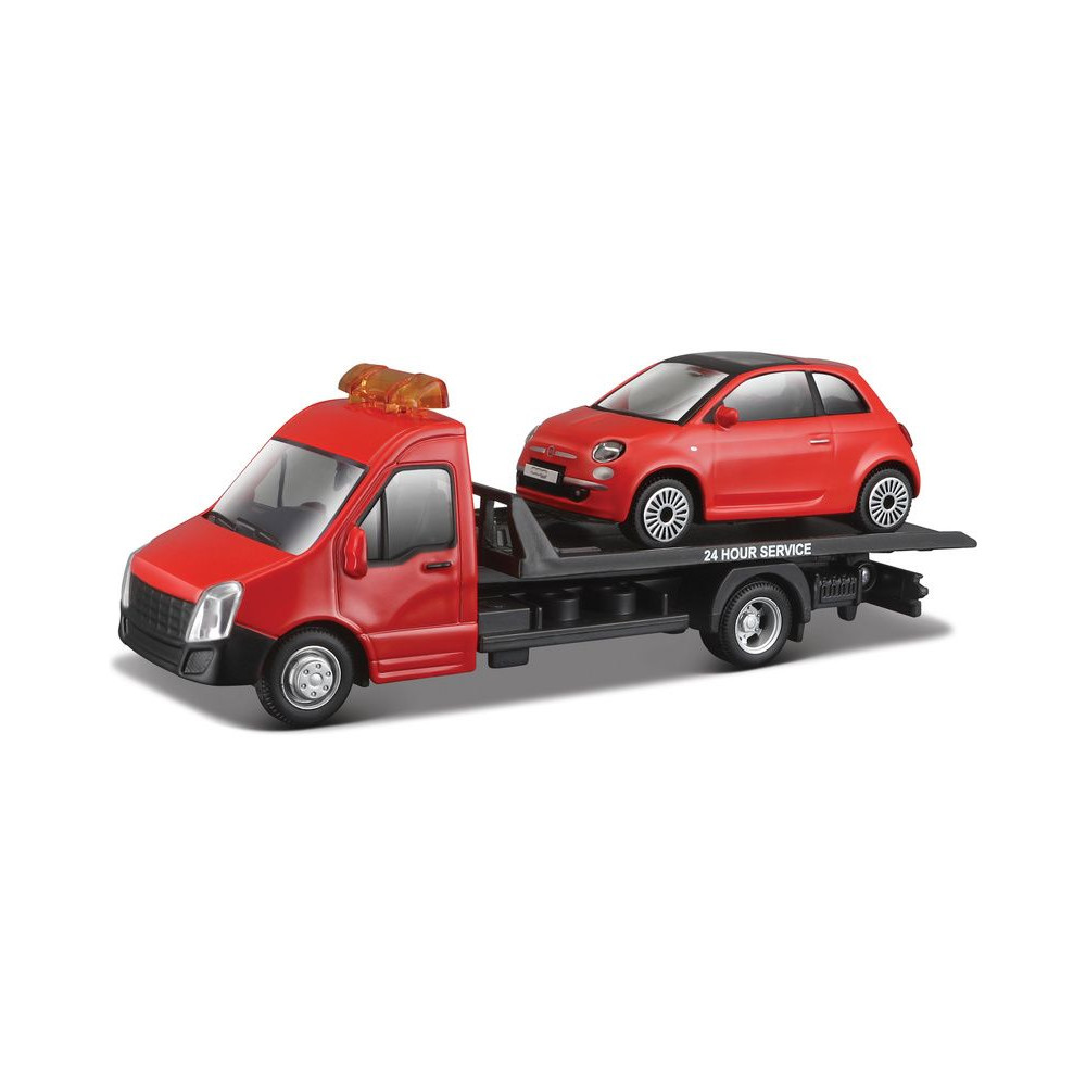 Bburago 18-31402 modell - Vontatóautó egy Fiat 500 autómodellel 1:43 méretarányban, fém és műanyag alkatrészekből készült. A modell mozgatható raktérrel rendelkezik az autómodell be- és kirakodásához. A modellek színe piros.