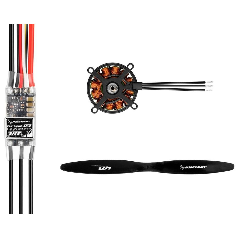 PLATINUM 2603SL 1480KV AC villanymotor szett forgó burkolattal és PLATINUM 18A F3P szabályozóval 4D beltéri akrobatikus repülőgép modellekhez: akro 300g, 3D/4D 160g, KV1480 rpm V-n, 3S LiPo tápegység, gumikeret, 8.3x3.8" karbon légcsavar.