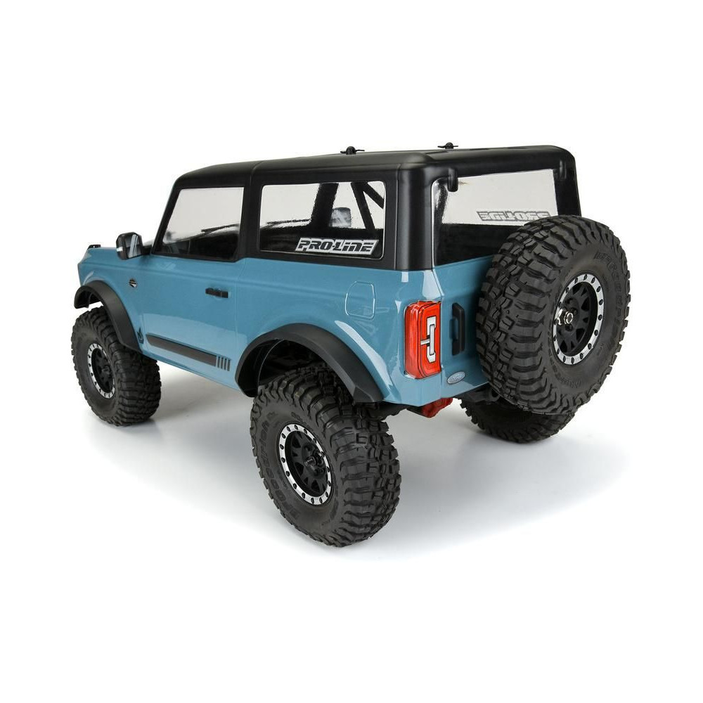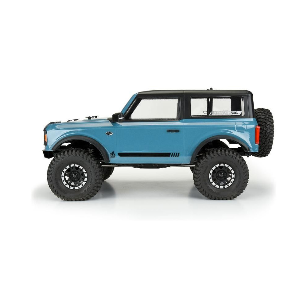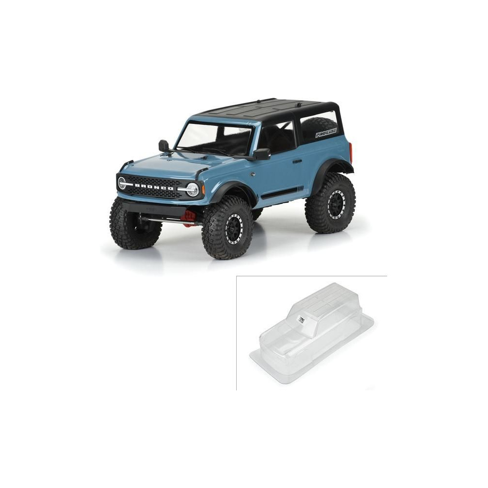 Pro-Line karosszéria tiszta Ford Bronco 2021, 1:10 méretarányú RC Crawler autókhoz, tengelytáv 290mm, hossz 439mm, szélesség 180mm. Tartós lexánból készült. Tartalmazza a fröccsöntött fekete műanyag első hűtőrácsot, sárvédőket, tükröket, kilincseket, ablaktörlőket és pótkeréktartót.