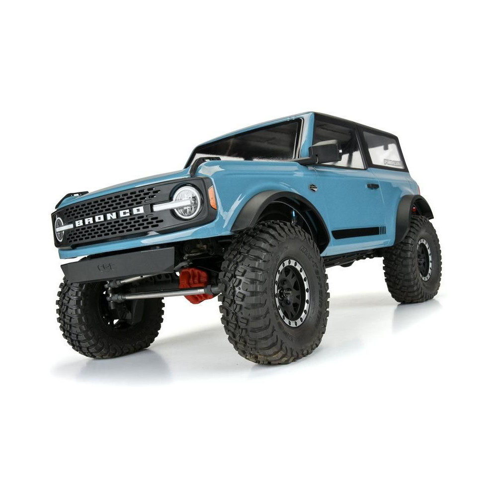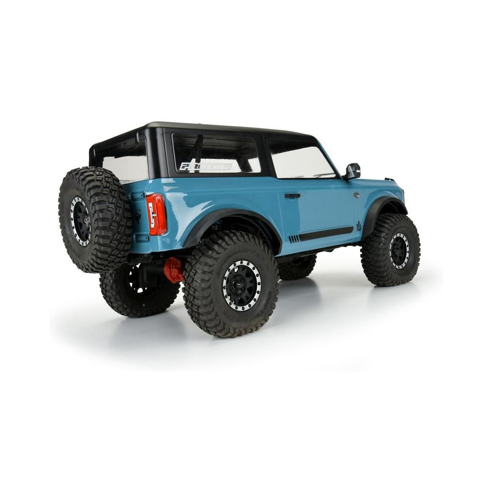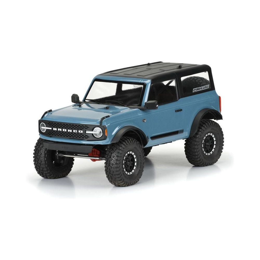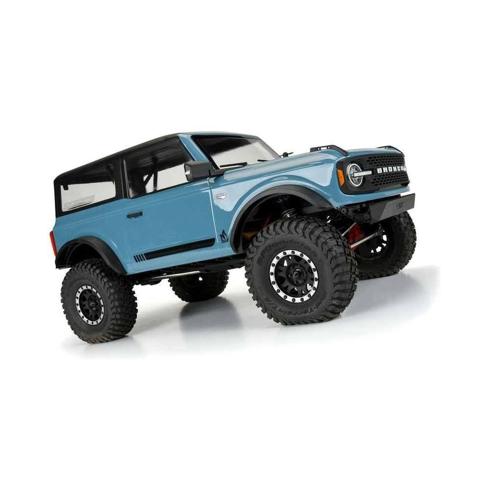 Pro-Line karosszéria tiszta Ford Bronco 2021, 1:10 méretarányú RC Crawler autókhoz, tengelytáv 290mm, hossz 439mm, szélesség 180mm. Tartós lexánból készült. Tartalmazza a fröccsöntött fekete műanyag első hűtőrácsot, sárvédőket, tükröket, kilincseket, ablaktörlőket és pótkeréktartót.