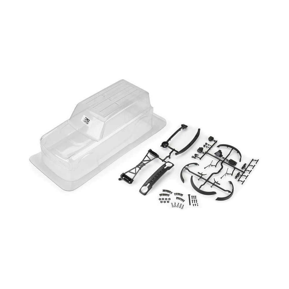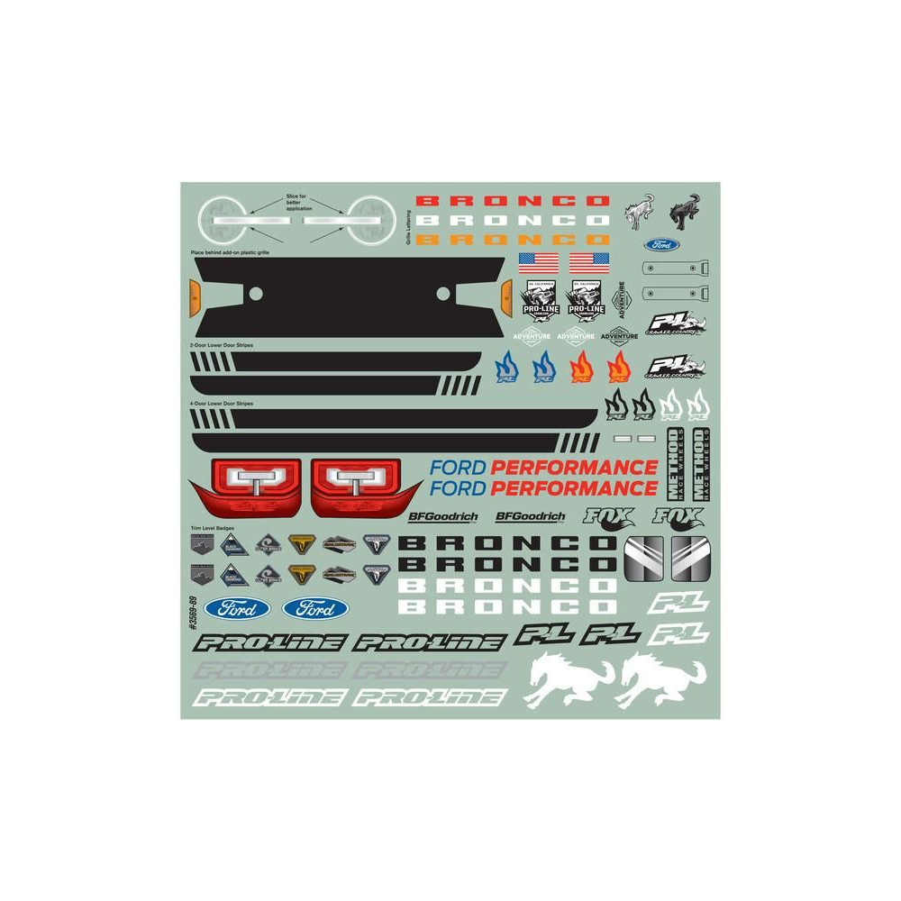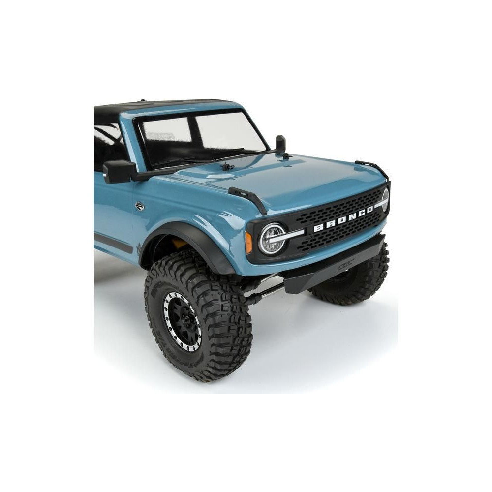A Pro-Line egy 2021-es Ford® Bronco karosszériát kínál 290 mm-es tengelytávval hagyományos kerekekhez vagy lánctalpas alvázhoz, amelyhez első hűtőrács, fényszórók, karosszériaformázások és számos részlet tartozik. A matricalap tartalmazza a lámpákat, a kilincseket, a logókat és a feliratokat. A karosszéria átlátszó, és tartalmaz egy ablakmaszkot is. Miután lefújtad, helyezd fel a matricákat, és már kész is vagy. A Pro-Line ismét magasra tette a lécet a polikarbonát karosszéria kiegészítő részleteinek tekintetében, beleértve a fekete műanyagból öntött első homlokfalat, sárvédőket, tükröket, kilincseket és ablaktörlőket. A pótkeréktartó lehetővé teszi, hogy hátulra egy pótkereket szerelhessen, míg az első és hátsó lámpaburák LED-es világítást tesznek lehetővé (külön megvásárolható).