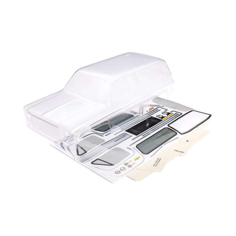 Traxxas Chevrolet Blazer 1979 tiszta. Trimmelt, festésre szorul. Tartalmazza a makett tartozékokat, ablakmaszkot és matrica lapot. 312 mm-es tengelytávú alvázhoz tervezve.