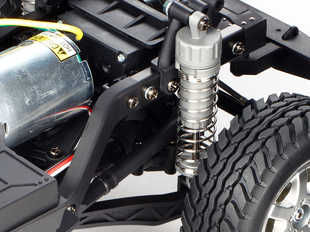 | CC-02 Chassis - Off Road, Evolved Rebríkový rám podvozku CC-02, ktorý je navrhnutý pre širokú škálu terénnych situácií vrátane skalnatého terénu, je inšpirovaný vozidlami plnej veľkosti a je základom jeho vynikajúcej odolnosti. Zostava 4WD využíva motor pozdĺžne za prednou nápravou s oddelenou prevodovkou a prevodovou skriňou a hnacie hriadele prenášajúce výkon na diferenciálne prevody vpredu a vzadu. Vpredu a vzadu sa používa štvorprvkové tuhé zavesenie s olejovými tlmičmi CVA na všestrannú kontrolu aj na zradných skalných úsekoch. Tento model sa dodáva s matne pokovovanými sedemlúčovými kolesami a priľnavými pneumatikami s blokovým vzorom. |