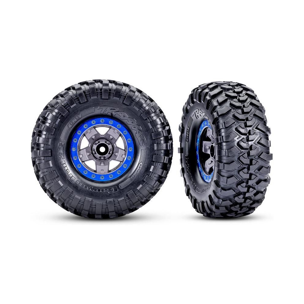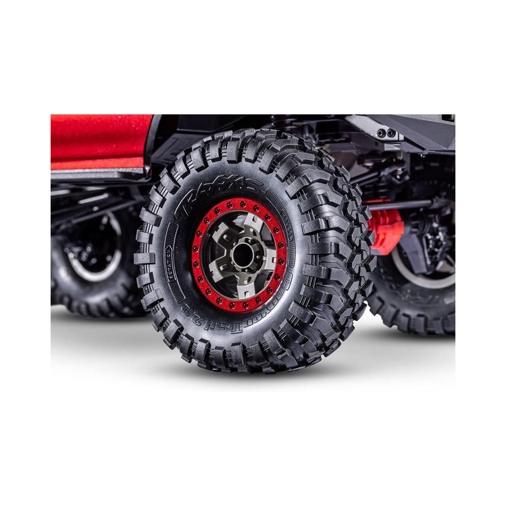 A Canyon Trail nagyméretű S1 extra lágy keverékű gumiabroncsok 2,2" átmérőjű kerekekre vannak szerelve, színes Beadlock dizájngyűrűvel. A keréktartó 12 mm-es.