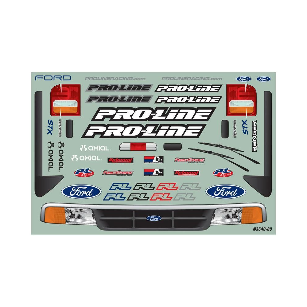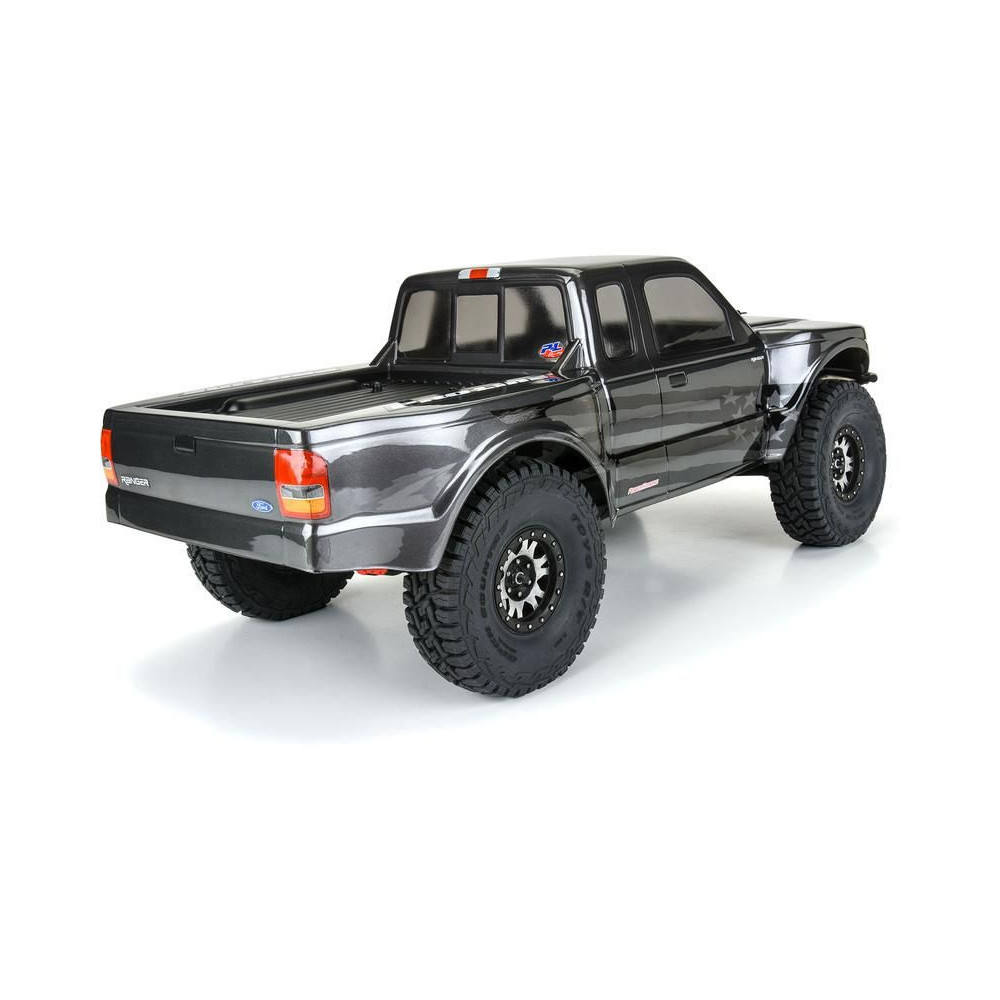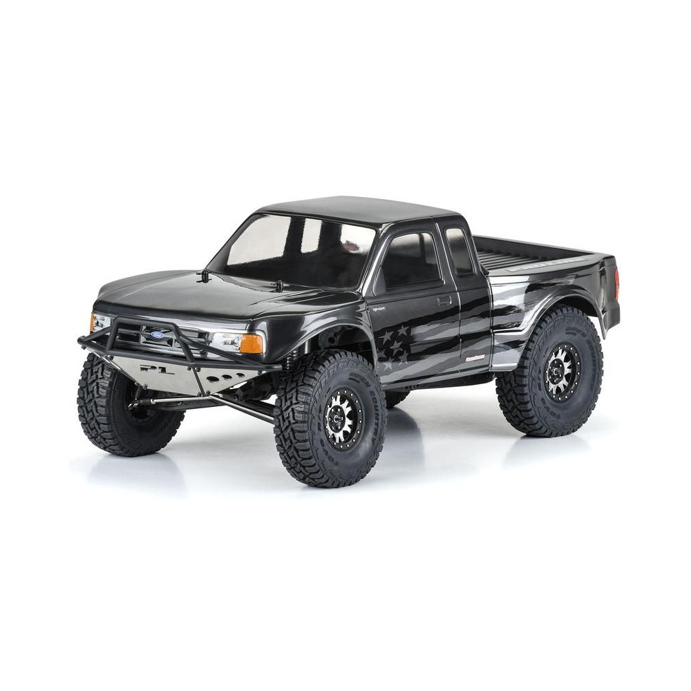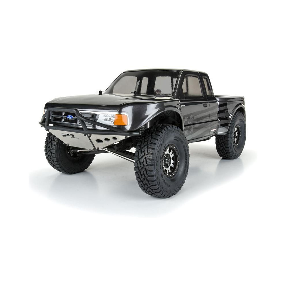 Pro-Line karosszéria világos 1993 Ford Ranger Pre-Runner, 1:10 méretarányú RC lánctalpas modellekhez, tengelytáv 313 mm, hossz 521 mm, szélesség 229 mm. Tartós lexánból készült. Ez a karosszéria kiálló agresszív sárvédőkkel rendelkezik, amelyek robusztus off-road megjelenést kölcsönöznek. A nagyobb sárvédők lehetővé teszik a modell és a nagyobb kerekek futtatását.
