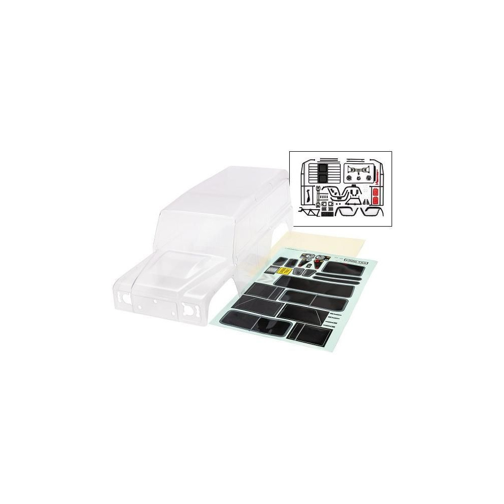 Traxxas karosszéria TRX-4 Land Rover Defender átlátszó (klipszmentes). Festést igényel. Beleértve az első maszkot, tükröket, kilincseket, tetőcsomagtartót és keréktartályt. Matricaív, ablakmaszk, csipesz nélküli tartó. 324 mm-es tengelytávval kompatibilis.