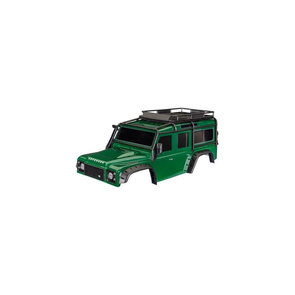 Traxxas TRX-4 Land Rover Defender karosszéria zöld (klipszmentes). Komplett, színes. Tetőcsomagtartóval, makett tartályokkal, emelővel és pótkerékkel együtt. Tengelytáv 324 mm. TRA8080R sárvédőkre való felszerelésre tervezve.