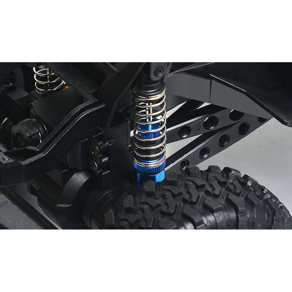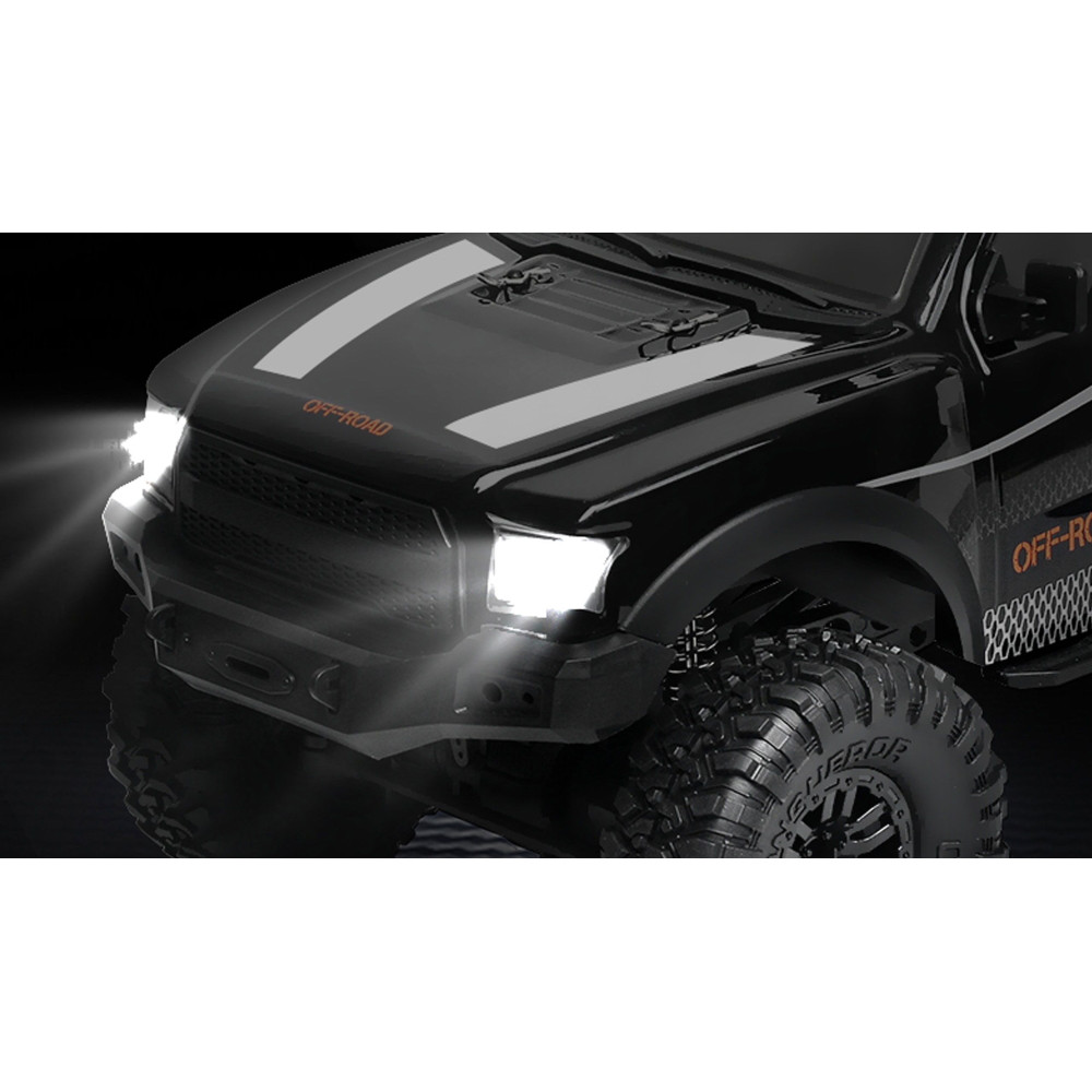 Egy SUV pickup nagyszerű megjelenését a legmodernebb funkciókkal ötvözik. Erőteljes motorjának, 4WD összkerékhajtásának és túlméretezett gumiabroncsainak köszönhetően ez az 1:10 méretarányú mászó terepjáró mindig megtalálja a kiutat a vadonból. Alkonyatkor a fényes LED-es világítás segít a terepen való tájékozódásban. Míg a fekete sötétített ablakok tökéletesen illenek a vad megjelenéshez, ennek a mászójárműnek a rakterét kisebb tárgyak szállítására is lehet használni - ami minden RC pilóta számára nagy öröm. A jármű műanyag vázát úgy tervezték, hogy hatékonyan elnyelje az ütéseket. A fém golyóscsapágyak, a fröccsenő víz ellen védett elektronika és a valódi fémrugókkal ellátott lengéscsillapítók hangsúlyozzák a modell minőségi benyomását. Az érzékeny, pisztoly típusú távirányító modern 2,4 GHz-es rádiótechnológiával rendelkezik, amely könnyen kezelhető, és interferenciamentes vezetést biztosít, így a sorozat több járművének egyidejű használata sem jelent problémát. A pick-up terepjárót RTR (Ready-to-Run) állapotban szállítjuk, azaz a működéshez szükséges összes alkatrészt, még a távirányító elemeit is, a szállítás tartalmazza.