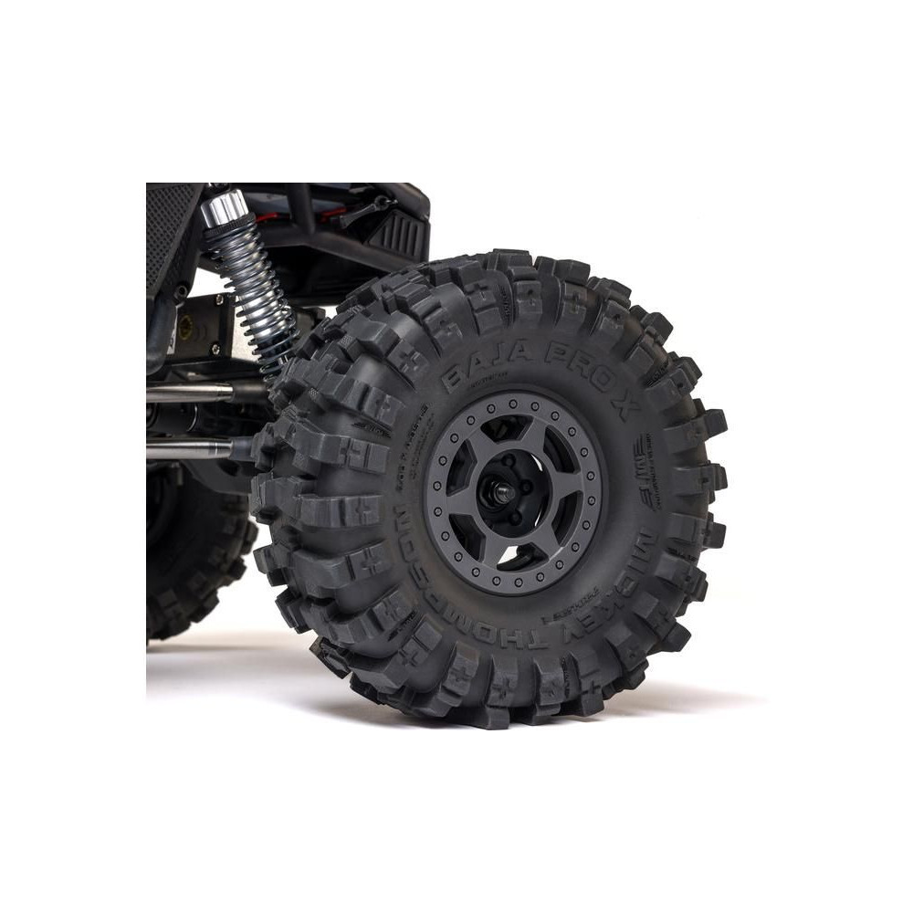 A hivatalosan engedélyezett Mickey Thompson Baja Pro X Pro-Line OE gumiabroncsok agresszív kialakítással segítenek leküzdeni a nehéz utakat és akadályokat. Pro-Line OE Holcomb 1.9"-os kerekekre vannak szerelve. A gumiabroncsok dupla, nyitott cellás habbetétekkel vannak kitöltve, puha külső habbal és kemény belső habbal.