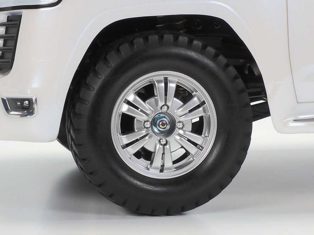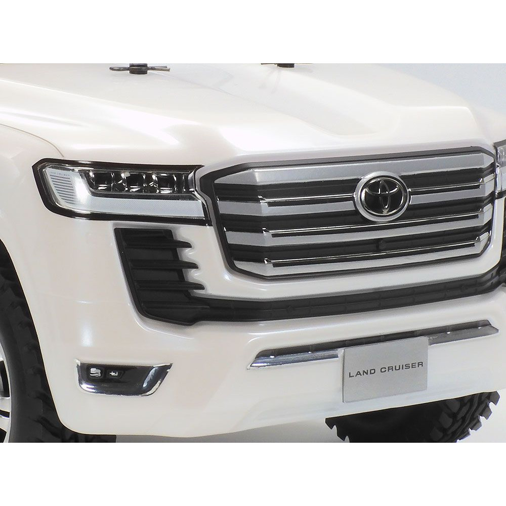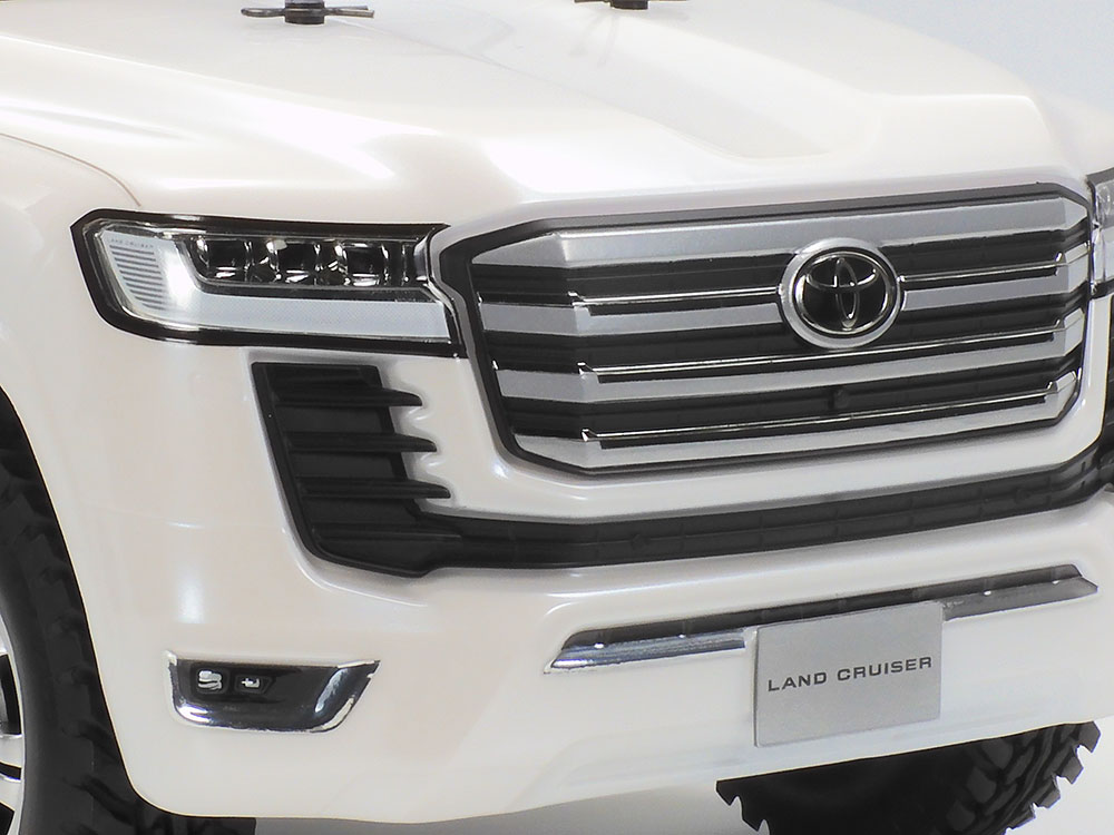 Az első generációs modell 1951-es bevezetése óta a Toyota Land Cruiser a világ egyik legikonikusabb 4WD-s járműve. Ez az R/C modell összeszerelő készlet újraalkotja a 2021-ben piacra dobott Land Cruiser 300 sorozatot. A polikarbonát karosszéria valósághűen ábrázolja a szemet gyönyörködtető, méltóságteljes formákat, különálló részekkel, amelyek megragadják a nagyméretű első hűtőrács és a fémbevonatú alkatrészek jellegzetes vízszintes bordáit. A lámpatestek és a tükörelemek fémbevonatúak, az ajtókilincsek és a tetőn található cápauszony-antenna pedig különálló alkatrészekként jelennek meg a nagyobb realizmus érdekében. A tizenkét küllős ezüst színű kerekekhez blokkos mintázatú gumiabroncsok tartoznak.