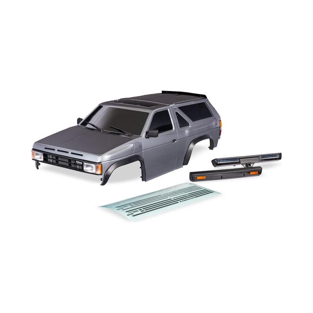Traxxas karosszéria TRX-4 Nissan Pathfinder 1988 ezüst (klipsz nélküli). Komplett, festett. Tartalmazza a hűtőrácsot, tükröket, kilincseket, sárvédőket, valamint az első és hátsó lökhárítókat. Tengelytáv 312 mm. TRA8080X sárvédőkre való felszerelésre tervezték.
