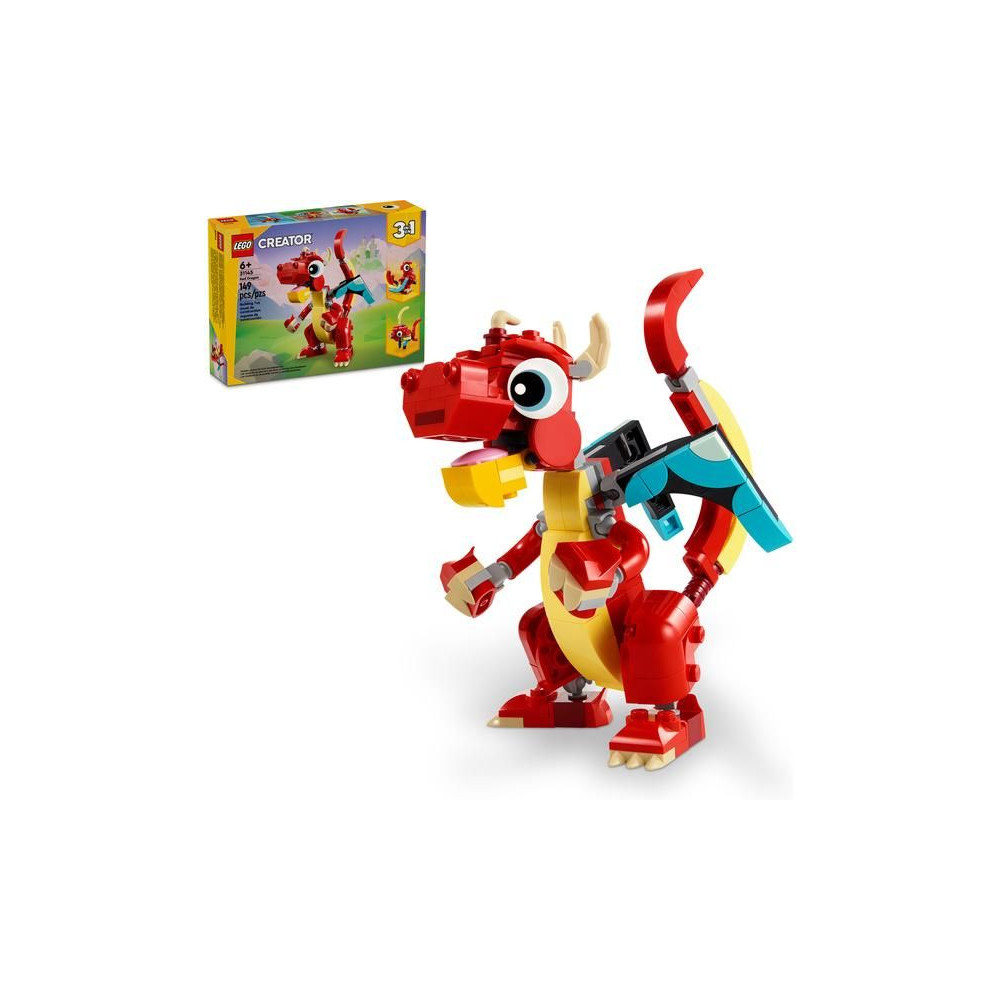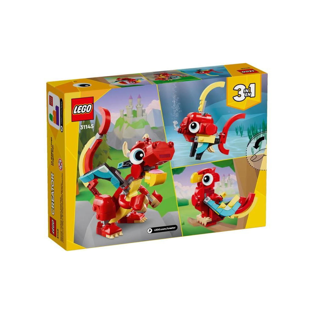 A LEGO® Creator 3 az 1-ben (31145) Vörös sárkány című LEGO® Creator 3 az 1-ben (31145) játékkal a 6 éves és idősebb kreatív gyerekek a mesék varázslatos földjére utazhatnak. Egy barátságos sárkányt építenek nagy szemekkel, mozgatható karokkal, mancsokkal, szárnyakkal, lábakkal, lábakkal, fejjel és szájjal. Amikor a látványos kalandok véget érnek, a modellt kiállítja a szobájában.