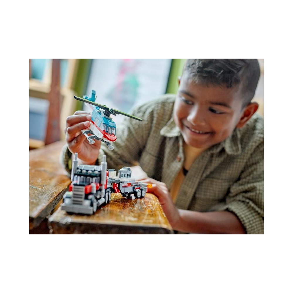 A 7 éves és idősebb gyerekek 3 készletet építhetnek és építhetnek újra ugyanabból a téglából a LEGO® Creator 3 az 1-ben platós teherautóval és helikopterrel.