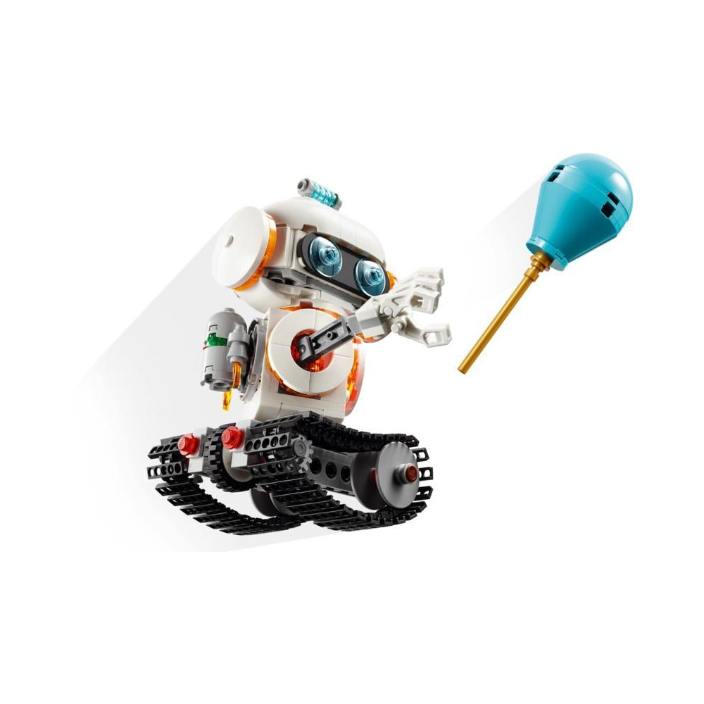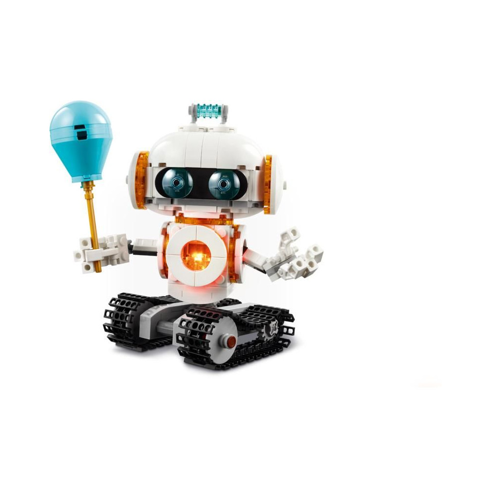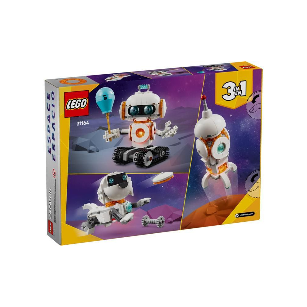 A LEGO® Creator 3 az 1-ben Űrrobot tudományos készlettel (31164) a fiúk és a lányok 8 éves kortól játszhatnak el történeteket a csillagokból. Ez a gyerekeknek szánt robotmodell mozgatható övekkel és jetpackkel, forgó testtel és fejjel, mozgatható karokkal és ujjakkal, egy lufival és egy fénykockával rendelkezik, amely megvilágítja a törzsét.