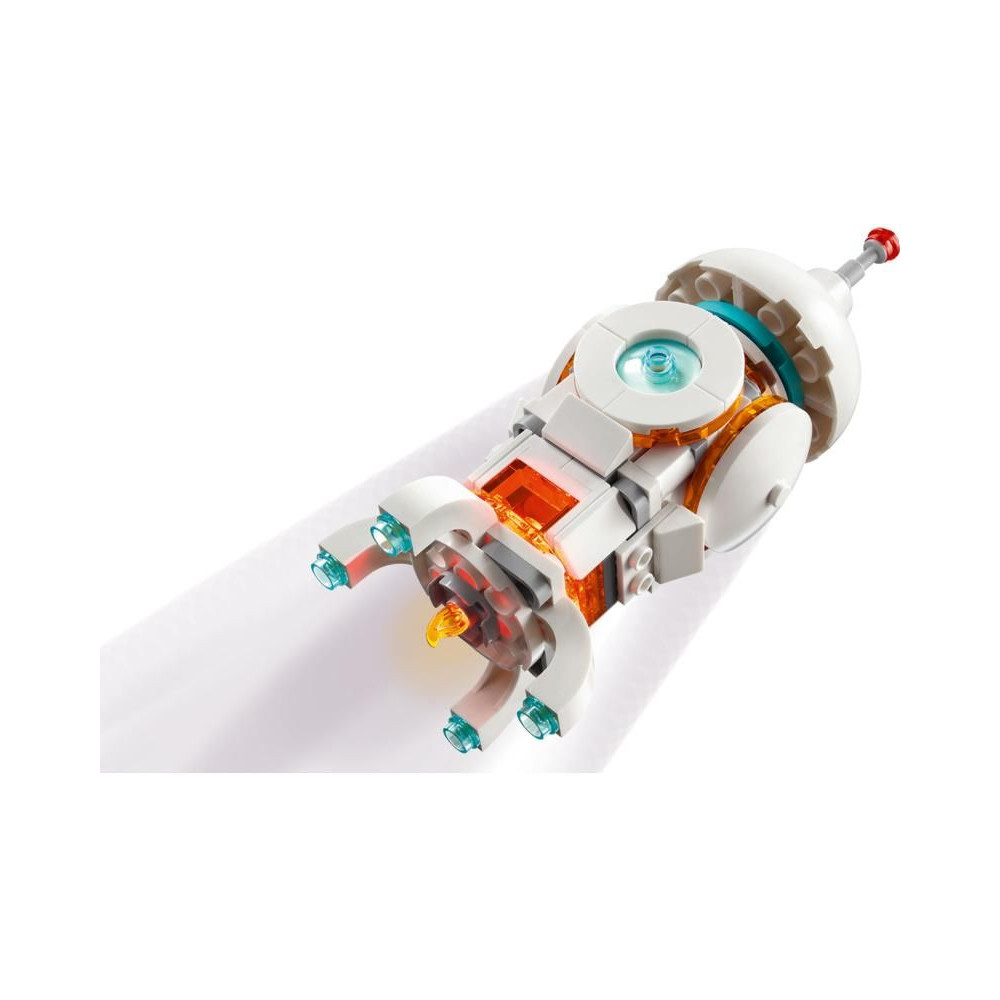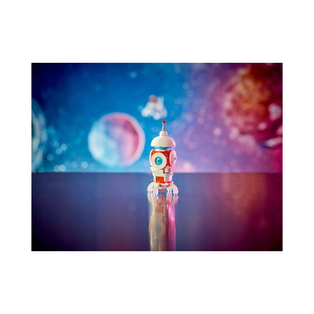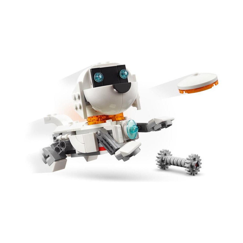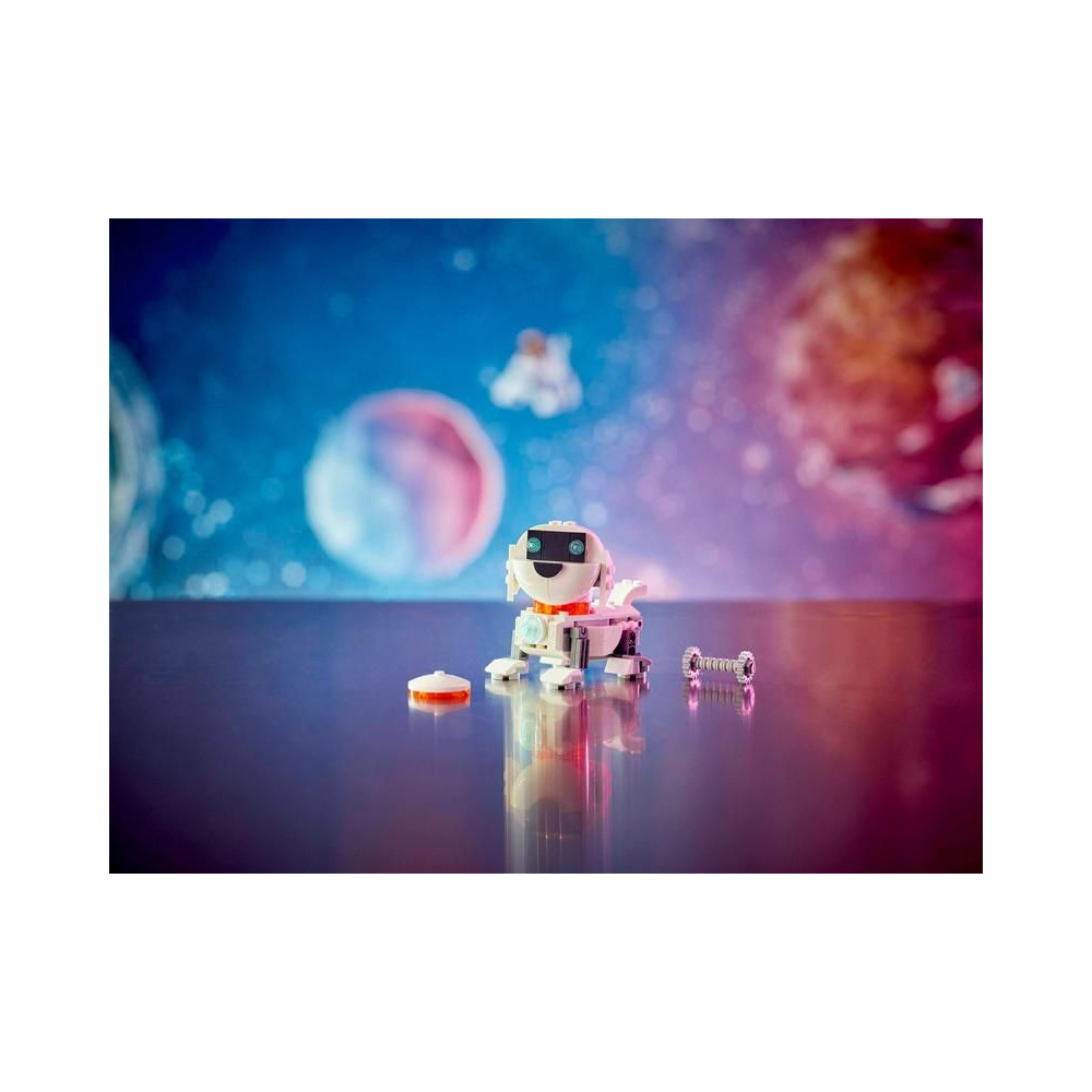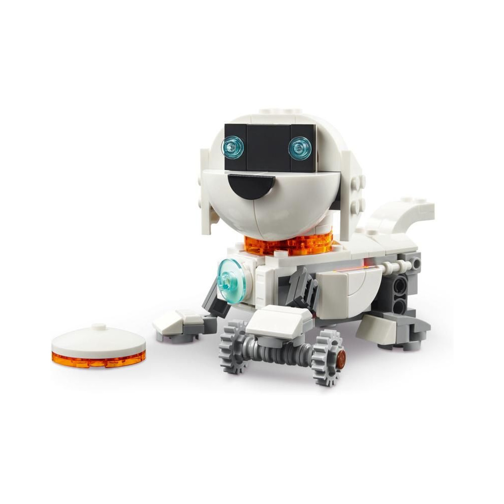 A LEGO rajongók 3 különböző akciódús űrmodellt építhetnek és alakíthatnak át ugyanazokból a kockákból: egy mozgó síneken guruló robotot, egy mozgó űrkutya figurát csontokkal és repülő koronggal, vagy egy űrrakétát. Mindhárom modell nagyszerű ajándék űr témával, amivel a gyerekek nagyon jól fogják magukat szórakozni. A világító kocka megnyomásával (az elemek a csomagban találhatók) a gyerekek megvilágítják a modellt.