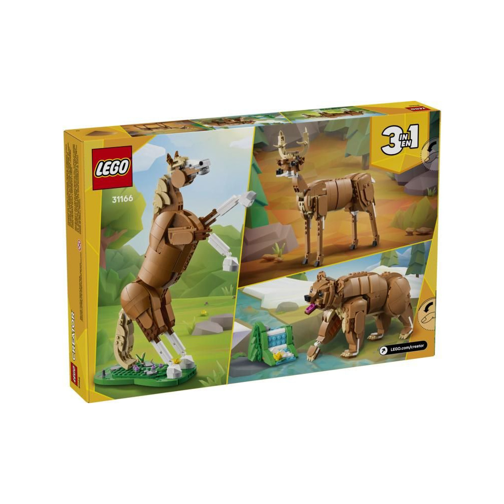 A gyerekek 3 különböző építési lehetőségre várnak ugyanabból a kockákból álló csomagból: Egy mozgatható LEGO® lovat, egy mozgatható medvét egy kis vízesésmodellel és egy mozgatható elegáns szarvast. Mindhárom állatfigura ebben az építőkészletben kreatív és szórakoztató ajándék a gyerekeknek.