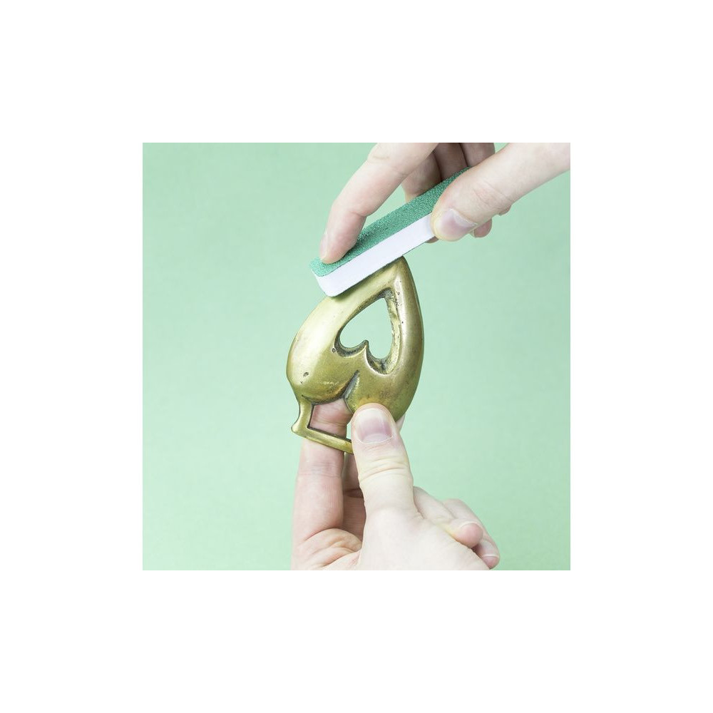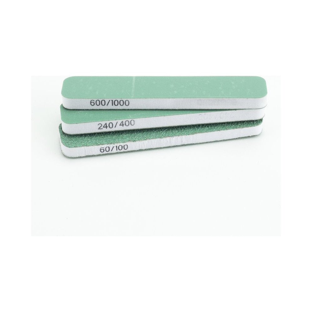 A csomagban 3 darab rugalmas, kétoldalas, 90 x 19 x 6 mm-es csiszolókorong található, mindegyik oldalon különböző durvasággal - durva P60/P100, közepes P240/P400 és finom P600/P1000. A forma alkalmazkodik a lekerekített felületekhez.