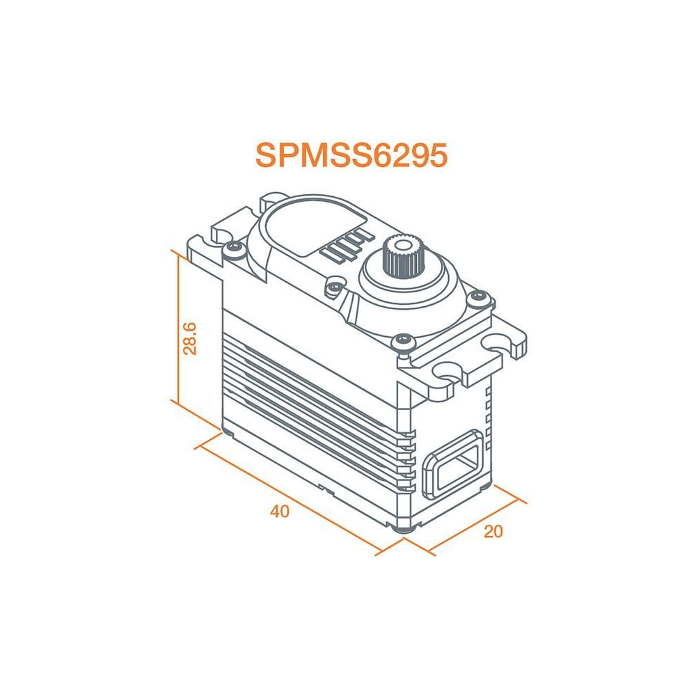 Erőteljes és gyors digitális vízálló vízálló szabványos méretű HV szervó kefe nélküli motorral 1:8 RC autókhoz, Spektrum S6295 fém testtel, nyomaték 30.0kg/cm @ 8.4V és sebesség 0.062s/60° @ 8.4V. Fém fogaskerekek, 2 golyóscsapágy, méretei: 40x20x38 mm, súlya 72g. 23T milliszekundum