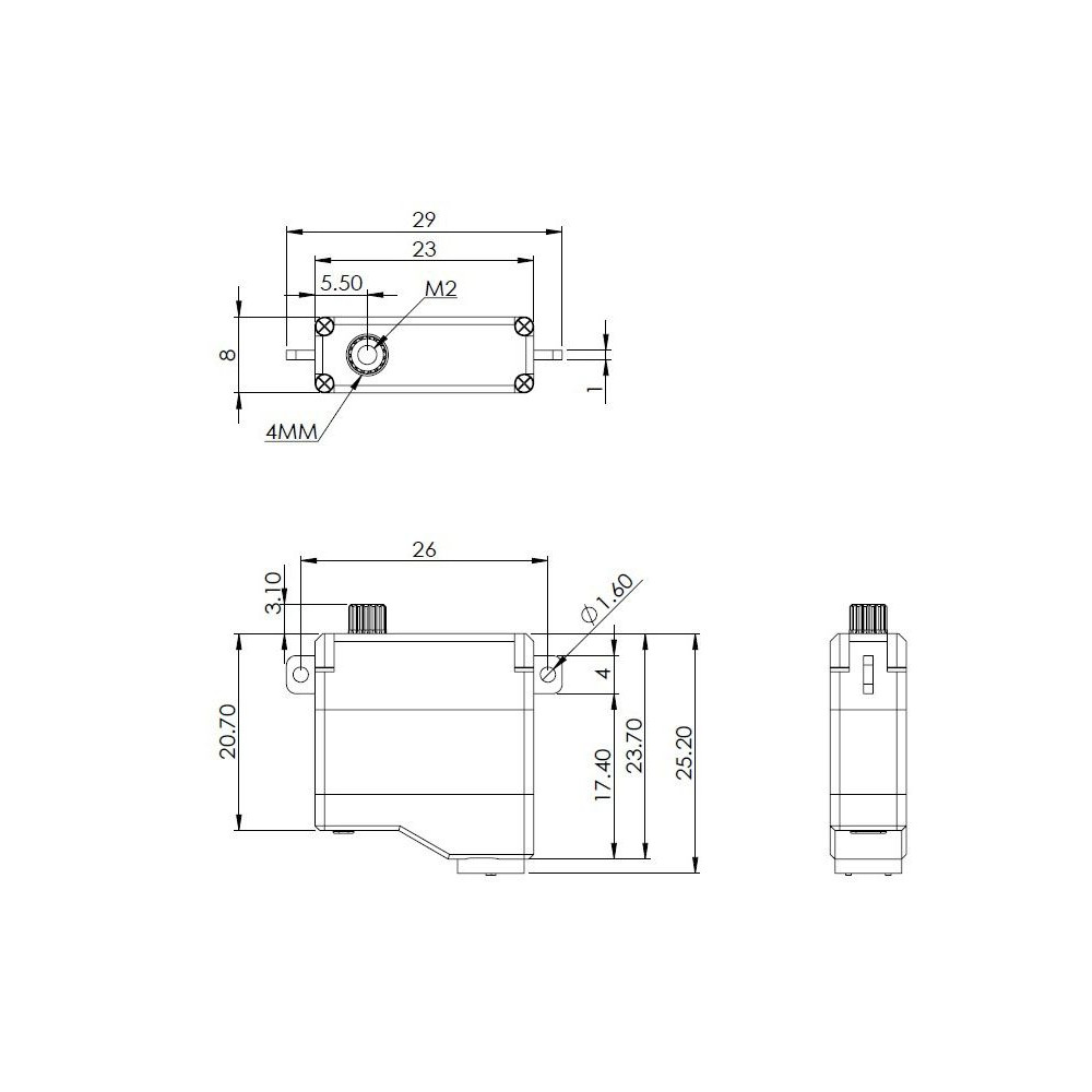 Anagy terhelés esetén is tökéletes hűtés érdekében a szervó egy alumínium dobozban van elhelyezve, amely a lapos rögzítéshez lábakkal rendelkezik.