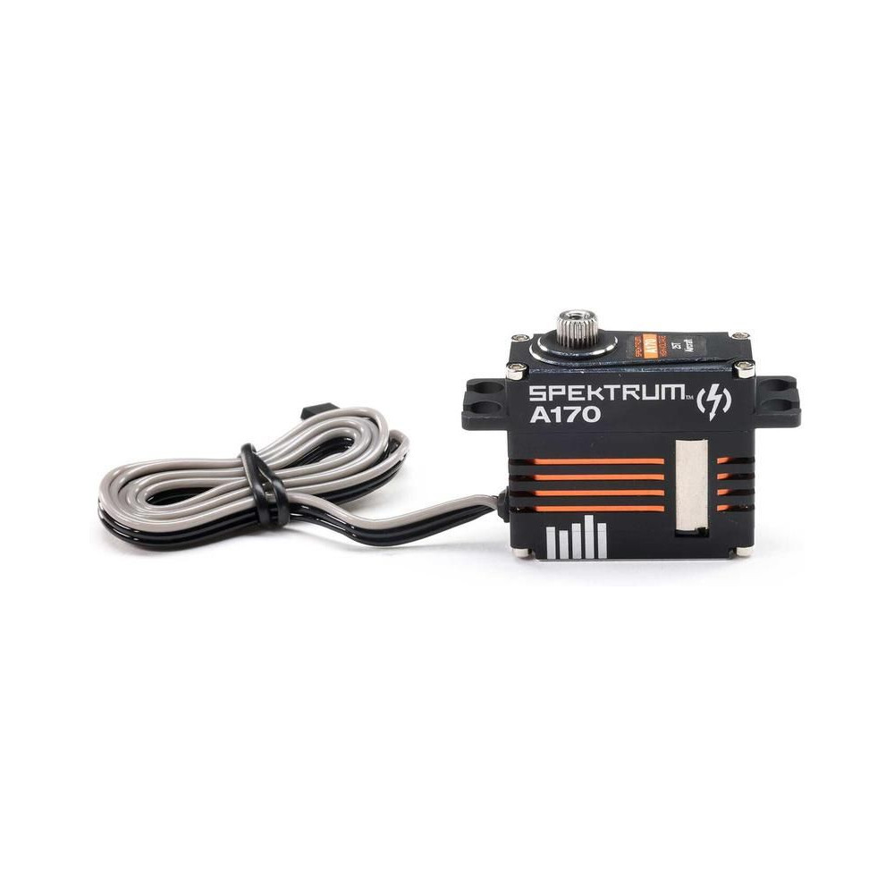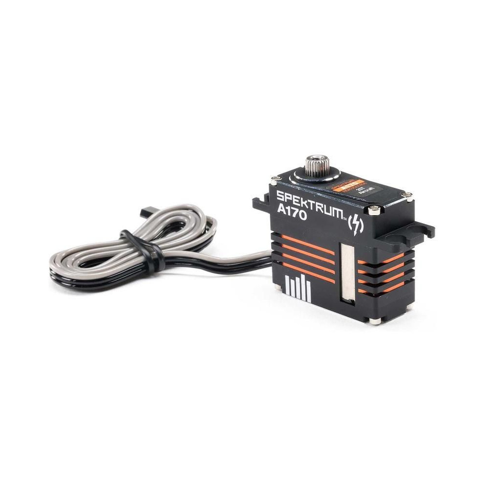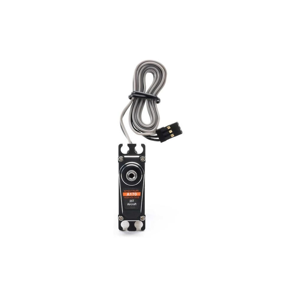 Spektrum A170 HV digitális szervo RC repülőgép modellekhez, nyomaték 7,92-12,2 kg·cm @ 6-8,4V, sebesség 0,11-0,08s/60°. 2x golyóscsapágy, fém fogaskerekek, teljes alumínium ház, DC mag nélküli motor, tápegység 4,8-8,4V, súly 45g, méretek 35,6x15,0x30,8mm. Méret 25T.