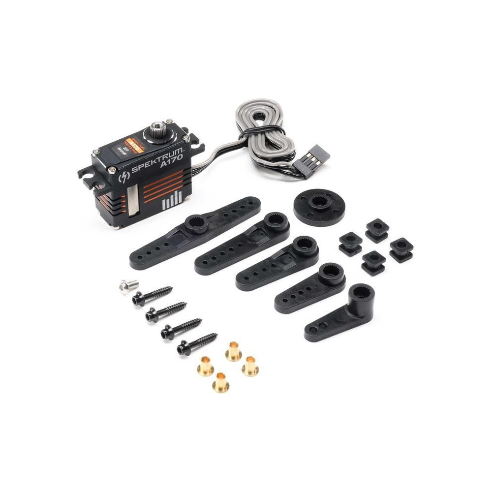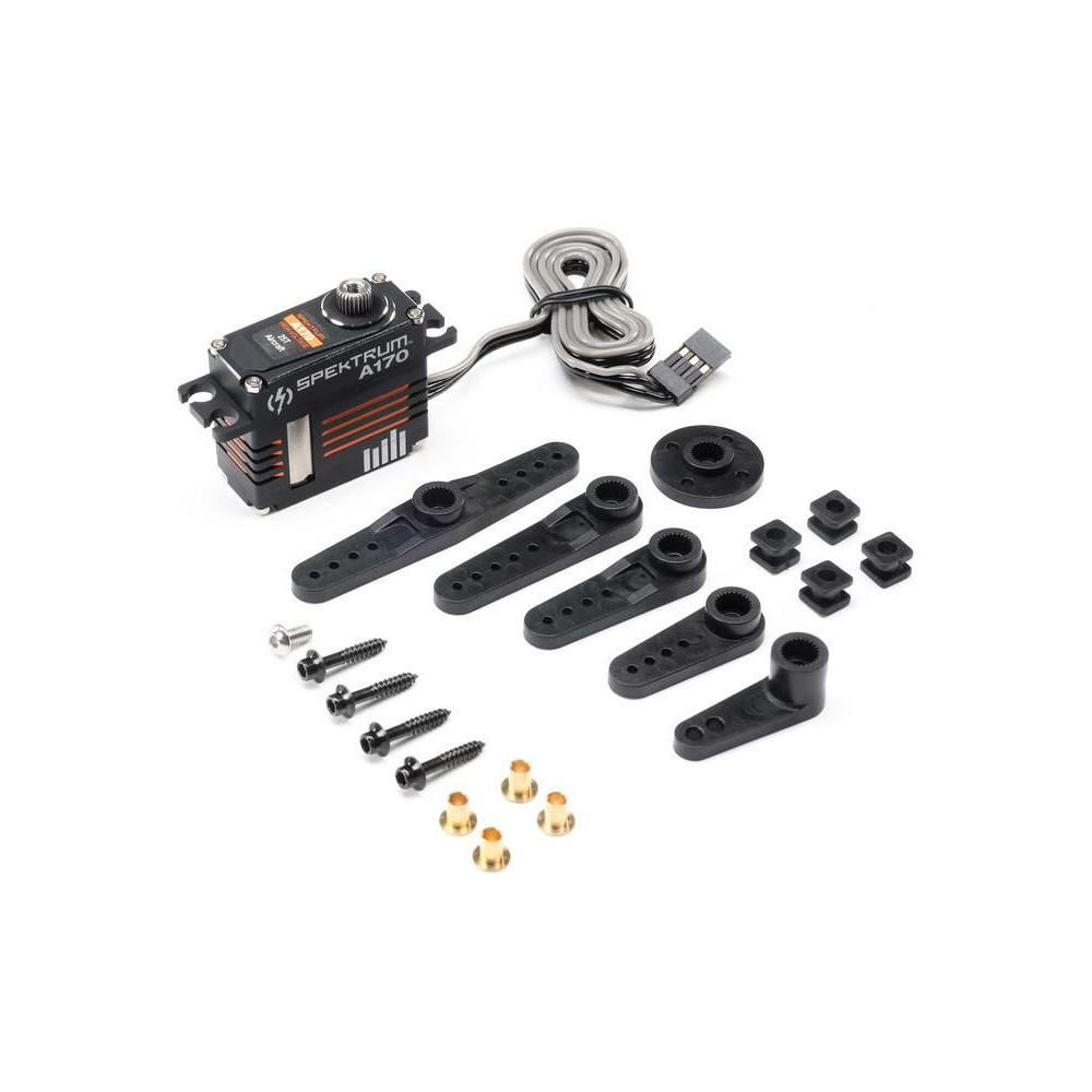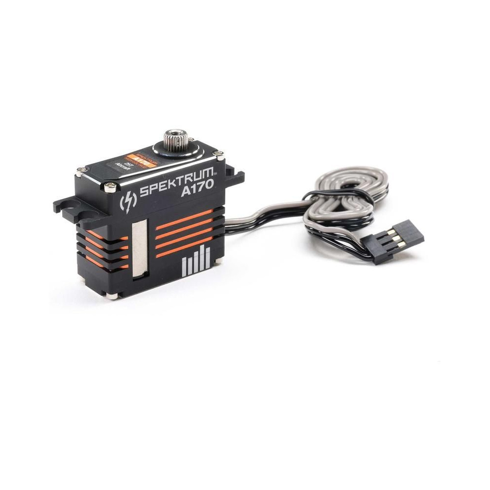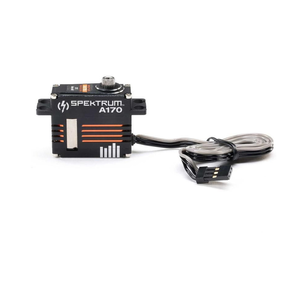 Spektrum A170 HV digitális szervo RC repülőgép modellekhez, nyomaték 7,92-12,2 kg·cm @ 6-8,4V, sebesség 0,11-0,08s/60°. 2x golyóscsapágy, fém fogaskerekek, teljes alumínium ház, DC mag nélküli motor, tápegység 4,8-8,4V, súly 45g, méretek 35,6x15,0x30,8mm. Méret 25T.