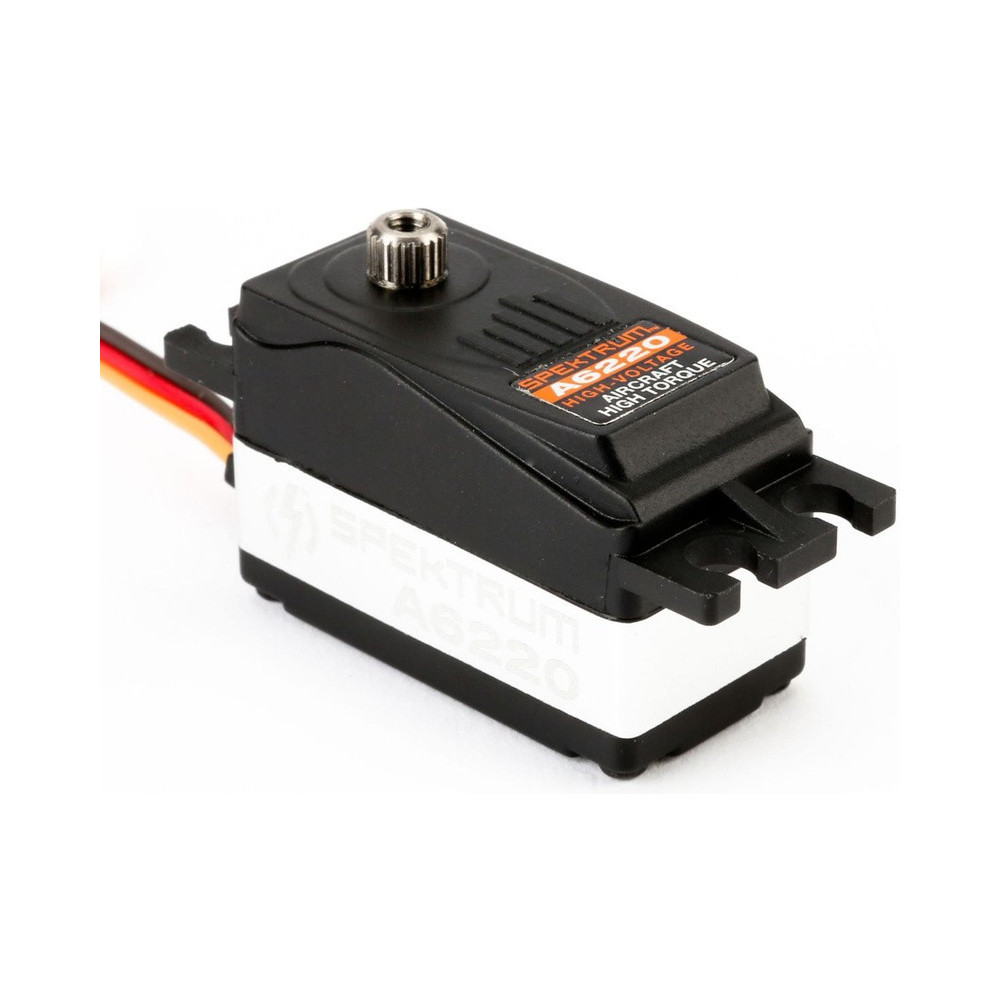 Alacsony és gyors digitális high-voltage szervó Spektrum A6220 elsősorban a nagyméretű repülőgép modellek szárnyaiba ajánlott. Nyomaték 9.0 kg.cm, sebesség 0.11 s/60° 7.4 V-on. Fémfogaskerekek, golyóscsapágyak, magasság csupán 26 mm. méretek 40.3 x 20.0 x 26.0 mm, tömeg 46 g.