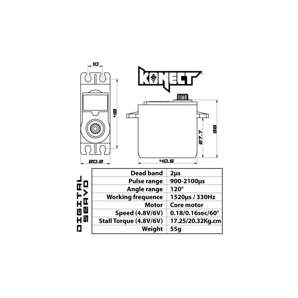 Digitális szervó, fém-fogaskerekek, húzóerő 17,21/21,06 kg/cm 4,8/6,0 V-on, sebesség 0,152/0,131s/60st 4,8/6,0 V-on, működési frekvencia: 1520µs/330hz, munkaszög: 120°, impulzus sugár: 900-2100µs, tömeg 61g, méretek: 40,5x20,2x27,7 mm.