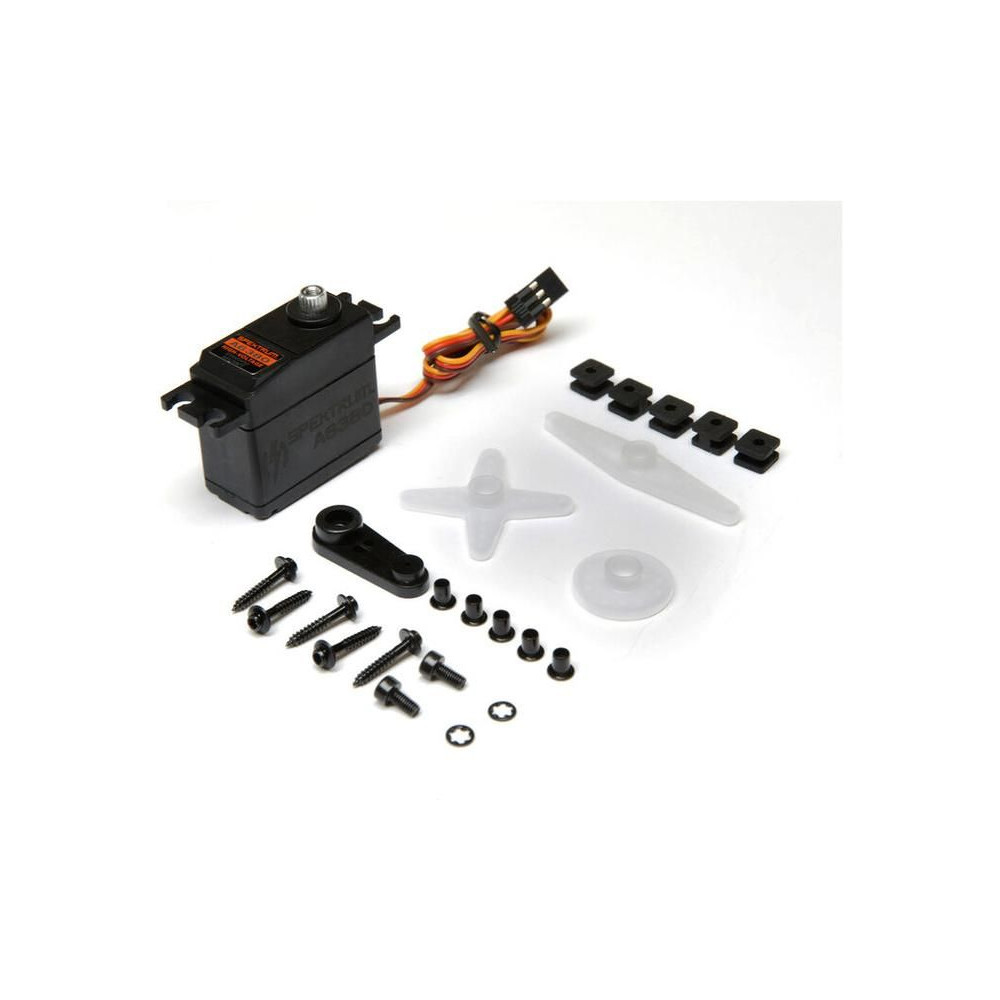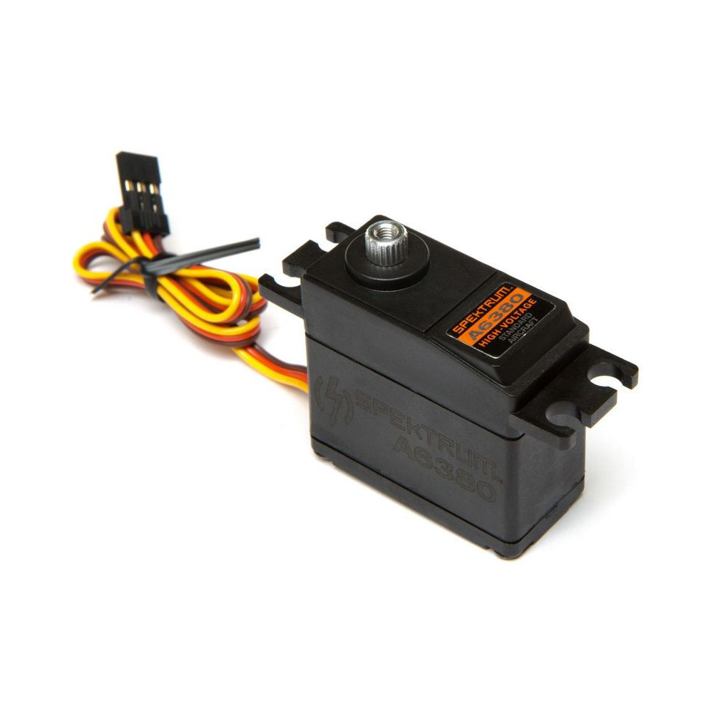 Gyors digitális High Voltage szervó standard méretben - Spektrum A6380 HV High Torque High Speed közepes és nagy méretű repülőgépekbe. Nyomaték 7,3 kg.cm @ 6V, 11,5 kg.cm @ 8,4V, méretek 19x37x39mm, tömeg 42,5g, táplálás 6-8,4V. Fémfogaskerekek, 2 csapágy, kábel 22 AWG. Sebesség 0,17 s/60° @ 6V, 0,13 s/60° @ 8,4V.
