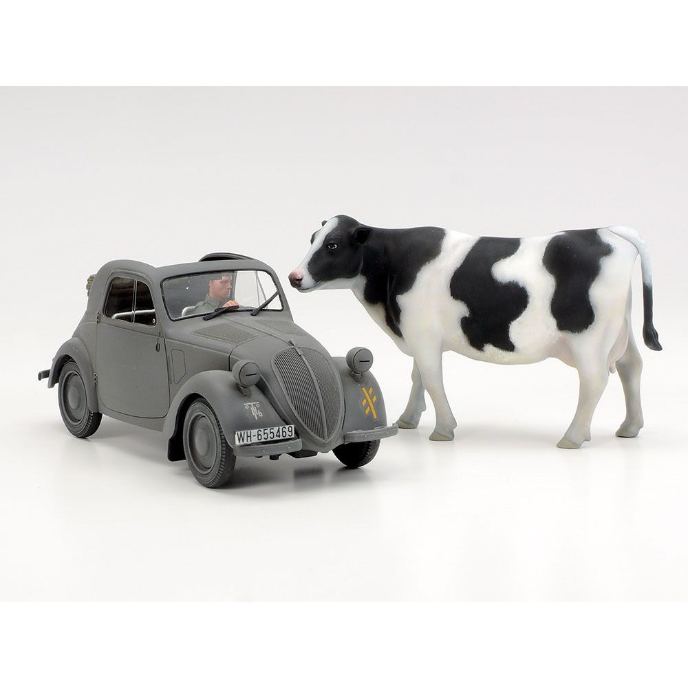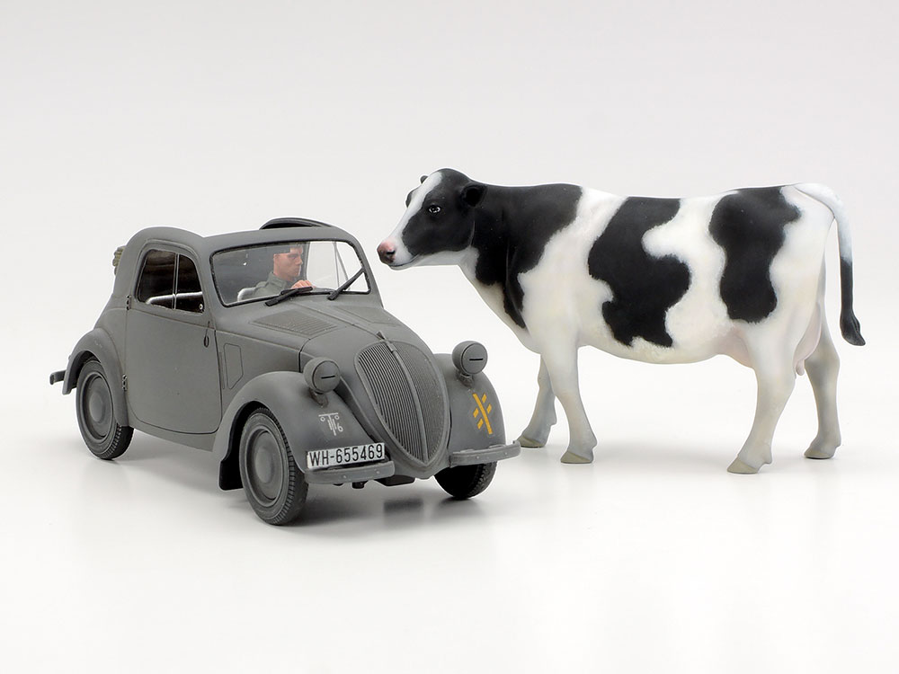 Nézd meg ennek a valóban hatalmas tehénnek a méretét, itt az 1/35 méretarányú Simca modellünkkel együtt.