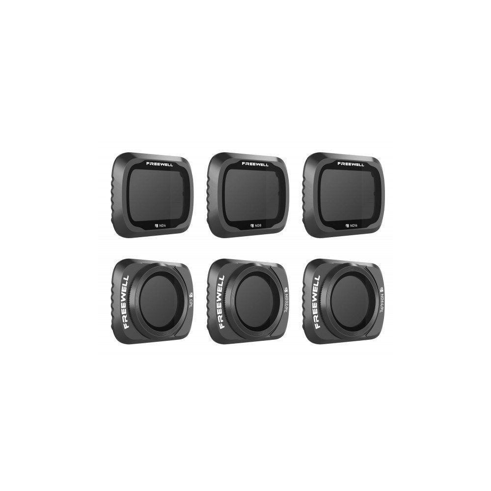 Hat darabos Freewell szűrőkészlet a DJI Mavic Air 2 készülékhez. A készlet ND4, ND8, ND16, CPL ND32/PL és ND64/PL szűrőket tartalmaz.