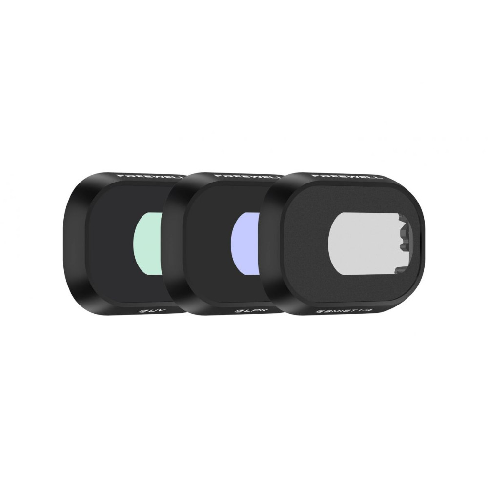 Három darab Freewell szűrőből álló készlet a DJI Mini 4 Pro drón kamerájához. A készlet UV, Snow Mist 1/4 és LPR szűrőket tartalmaz.