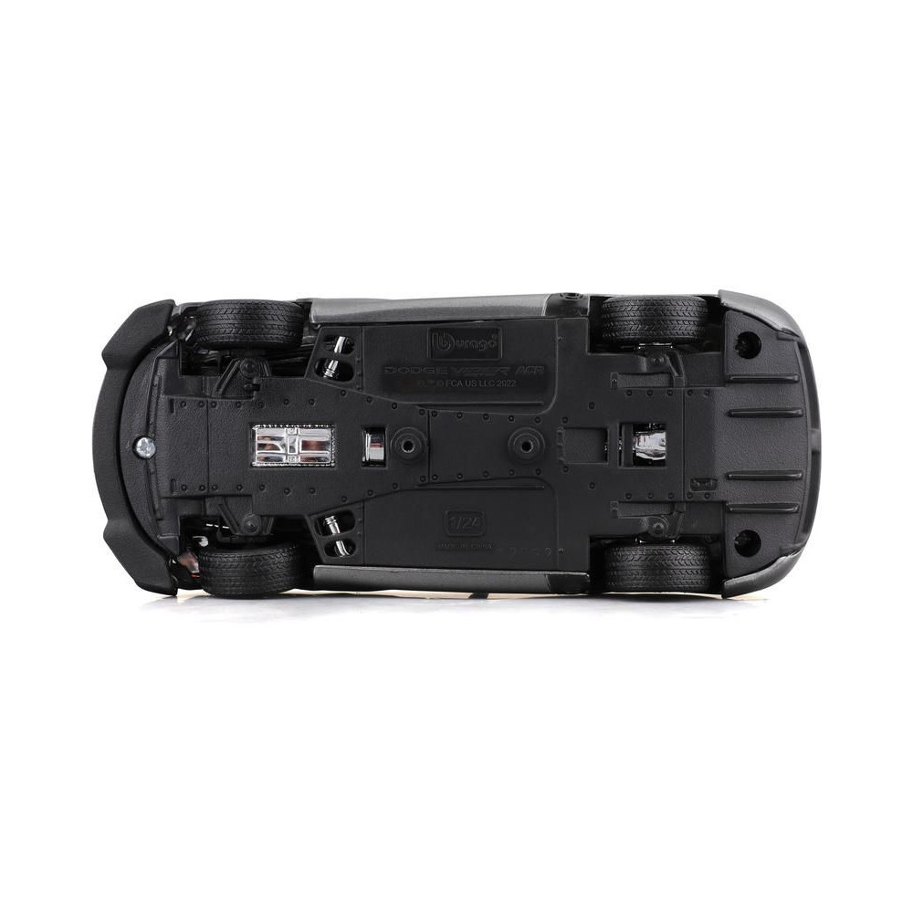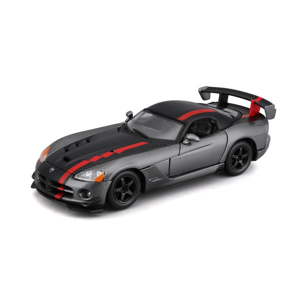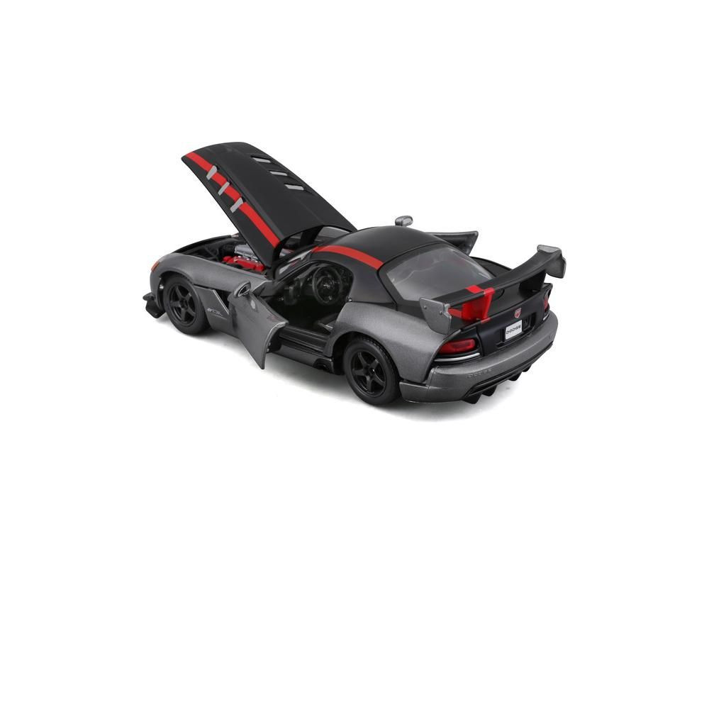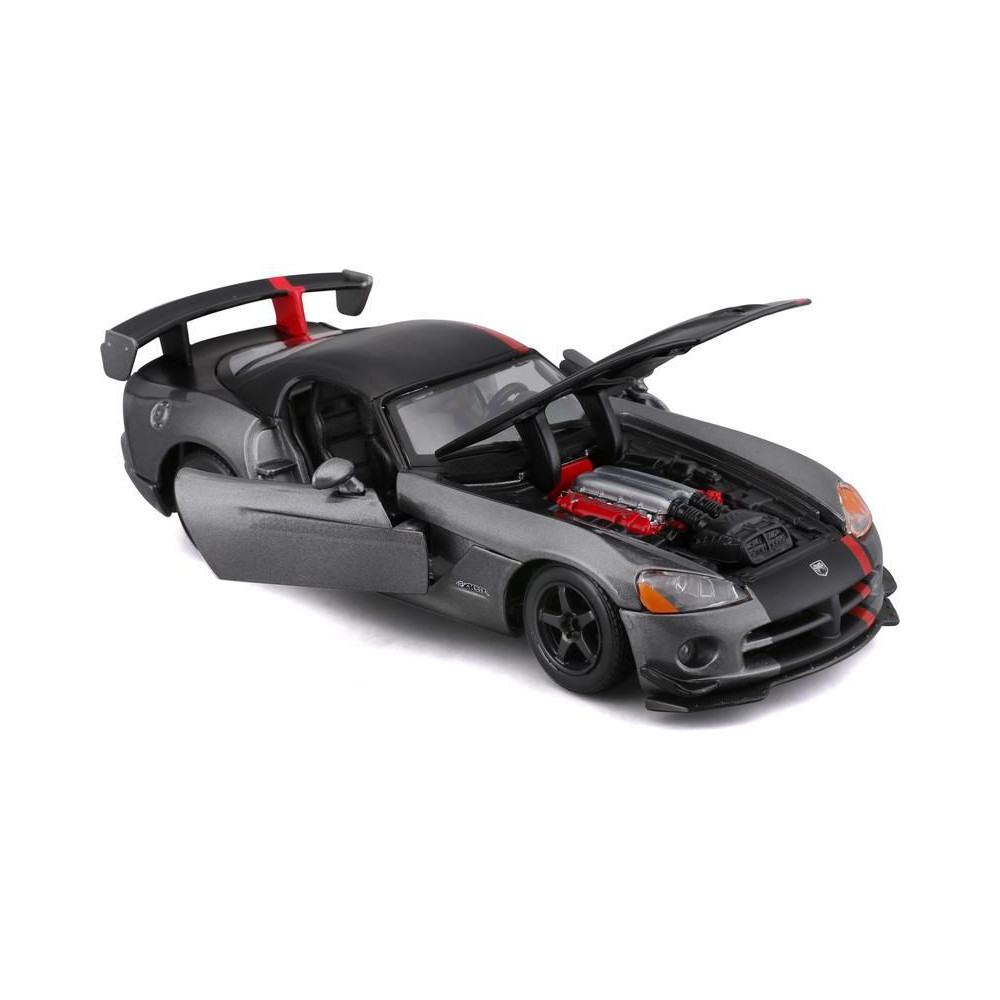 Fém autómodell 1:24 Bburago 18-22114 Dodge Viper SRT 10 ACR nem csak gyűjtőknek. Nyitható ajtókkal és motorháztetővel rendelkezik, a kormánykerék forgatása teljesen működőképes. A modell színe ezüst.
