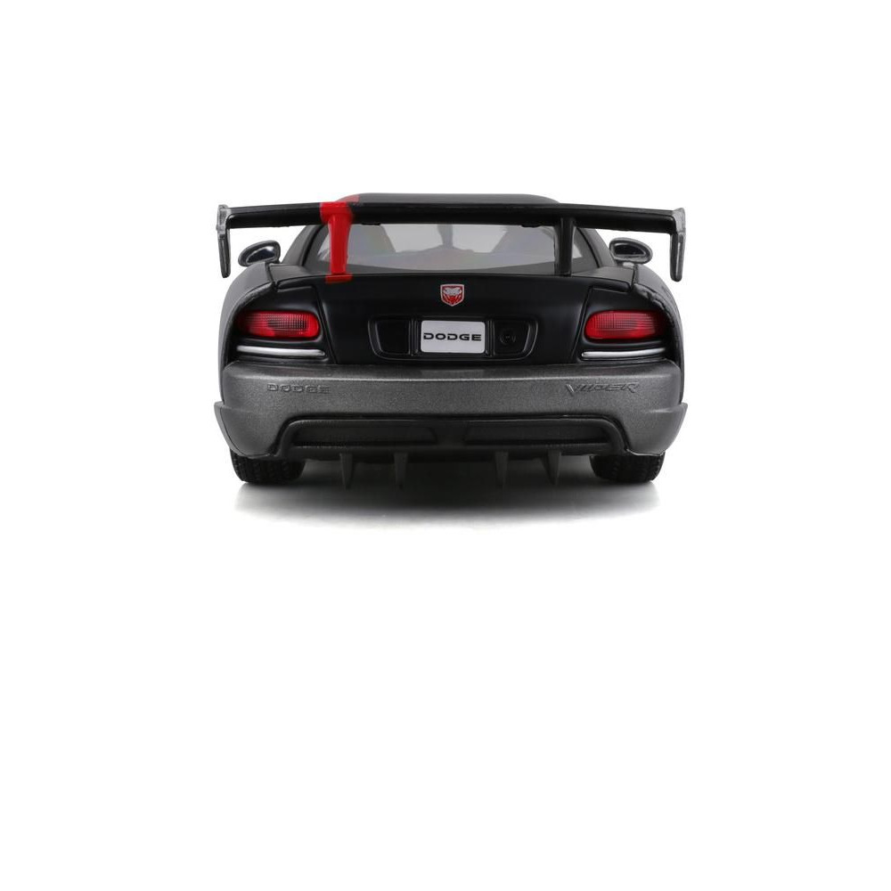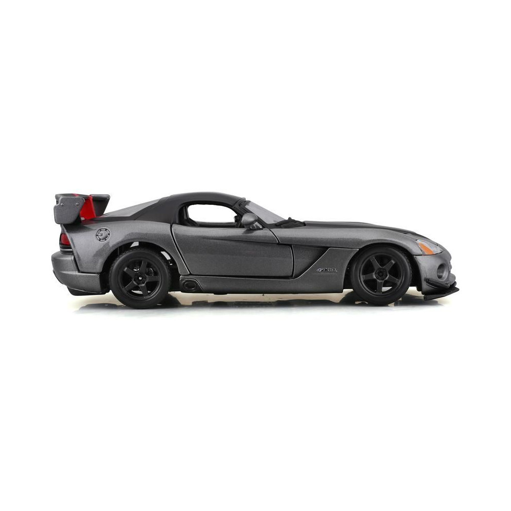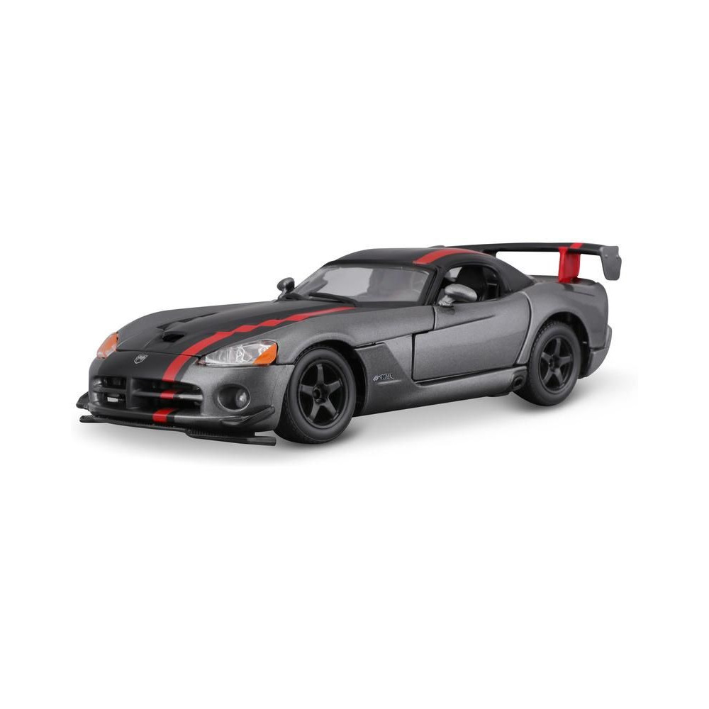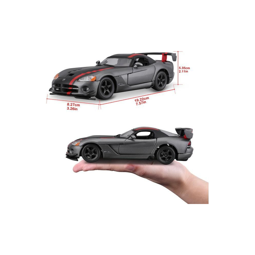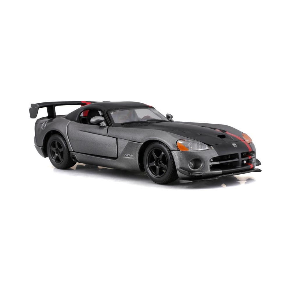 Fém autómodell 1:24 Bburago 18-22114 Dodge Viper SRT 10 ACR nem csak gyűjtőknek. Nyitható ajtókkal és motorháztetővel rendelkezik, a kormánykerék forgatása teljesen működőképes. A modell színe ezüst.