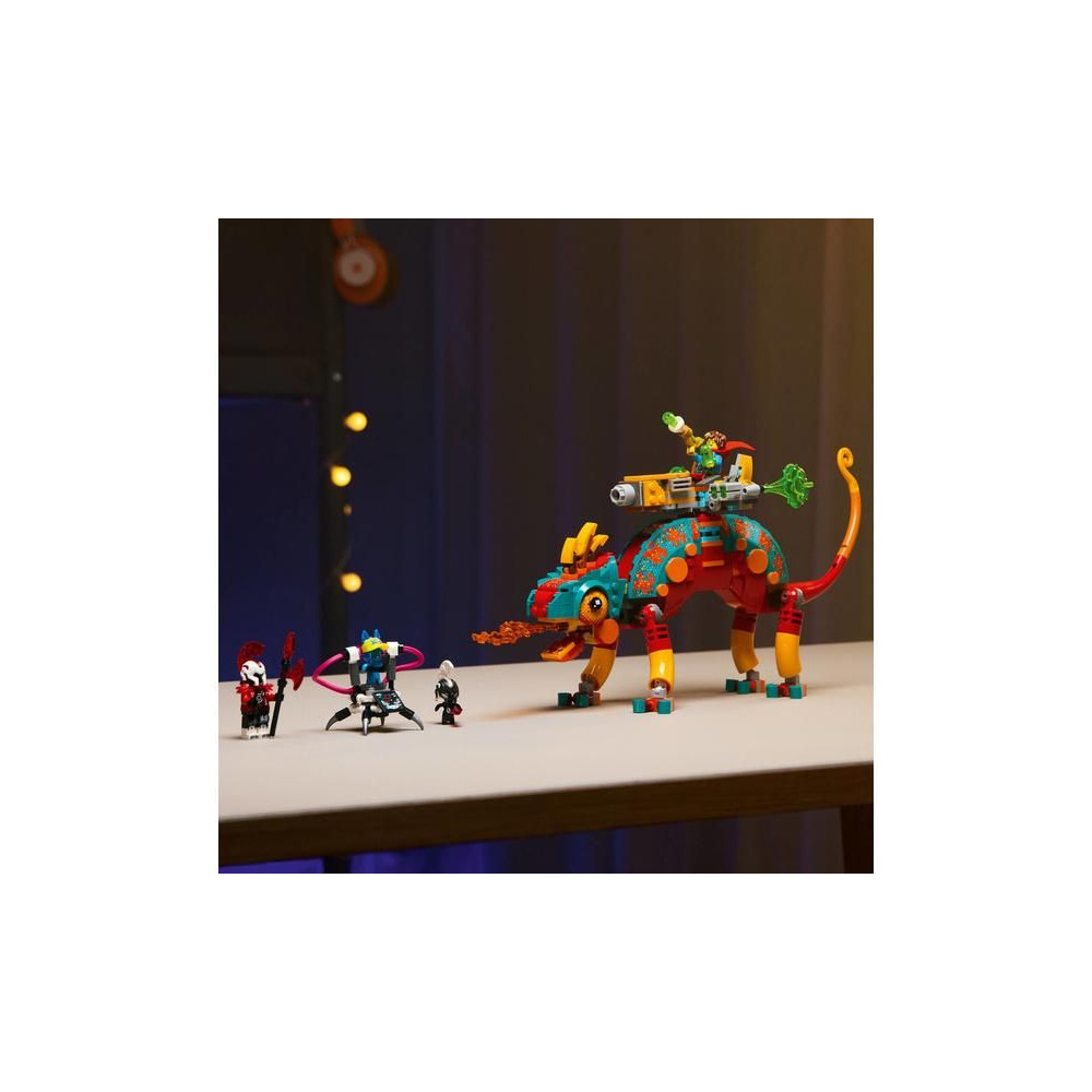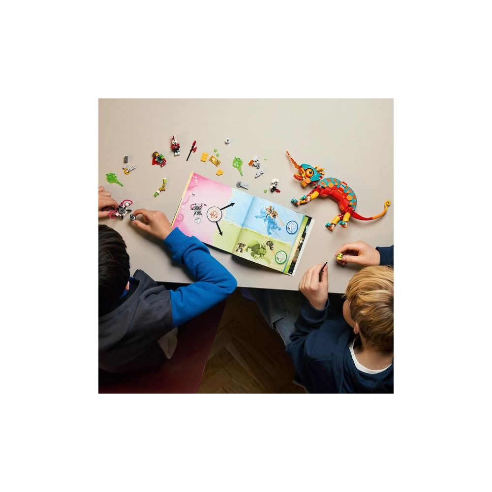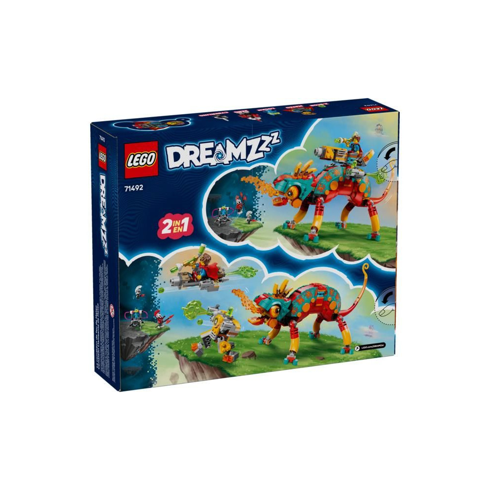A kis álmodozók nagyon jól fogják szórakozni egy kaméleon figura építése során, amelyet kétféleképpen állíthatnak össze - építhetnek egy tüzes kaméleon őrt egy lézertoronnyal és 4 kilövővel, vagy egy gyors sugárhajtású gépet és egy mini robotot. A kaméleonnak mozgatható szája, feje, farka, szemei és lábai vannak, és mindkét modell tele van nagyszerű részletekkel, beleértve a moduláris motorokat, amelyek kompatibilisek más LEGO® DREAMZzz™ 2025 készletekkel (külön kaphatók). Mateo és Zero minifigurák, valamint Logan, Z-Flek és Cyberman figurák életet lehelnek a történetbe és fantáziadús játékra inspirálnak.