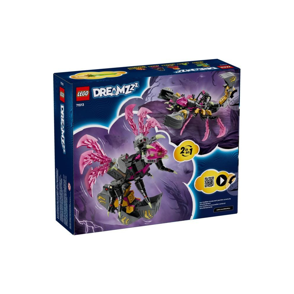 Gyújtsd be a képzelet szikráját a lenyűgöző LEGO® DREAMZzz™ Rémálom Skorpió Kotrógép (71513) építőkészlettel 7 éves kortól fiúknak és lányoknak. 2 összeszerelési lehetőséget kínál, így a gyerekek skorpió kotrógép vagy biomechanikus darázs formájában építhetnek játékot. Hatlábú skorpió módban ez a fantasztikus játék karmokkal, kilövőkkel és egy zúzó kotrógéppel van felszerelve. Biomechanikus darázs módban ez az elegáns szárnyas ragadozó mérges fullánkkal van felfegyverezve, amely ásó és kilövő formájában van.
