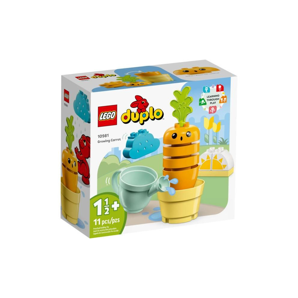 Az oktató LEGO® DUPLO® My First Carrot Grow (10981) segítségével a gyerekek szórakoztató módon ismerkedhetnek meg az egészséges életmóddal és a zöldségtermesztéssel. Ezt a színes építőszettet úgy tervezték, hogy a 18 hónapos korú kisgyermekeket erőszakmentesen bevezesse az önellátó életmódba, miközben a téglákat egymásra rakosgatva növesztik a sárgarépát. A gyerekek az időjárást is irányítani fogják a nap és a felhő alakú kockák segítségével, hogy a növényt ellássák azzal, amire szüksége van. És hogy tényleg ne maradjon le semmiről, egy locsolókanna segítségével megöntözhetik. A sárgarépa meglepett arckifejezése elárulja, hogy a víz nagyon hideg lehetett!