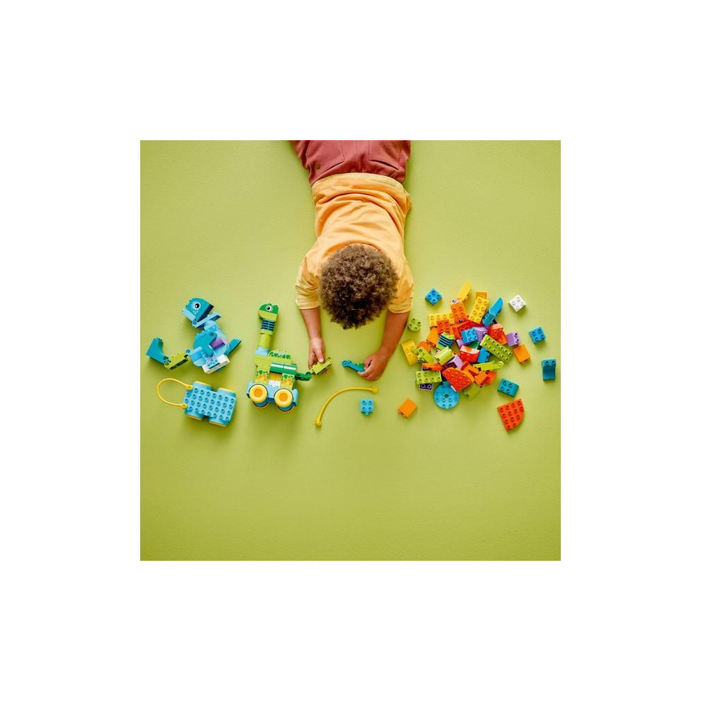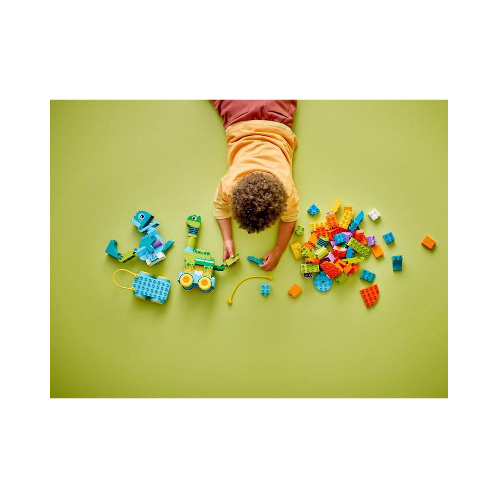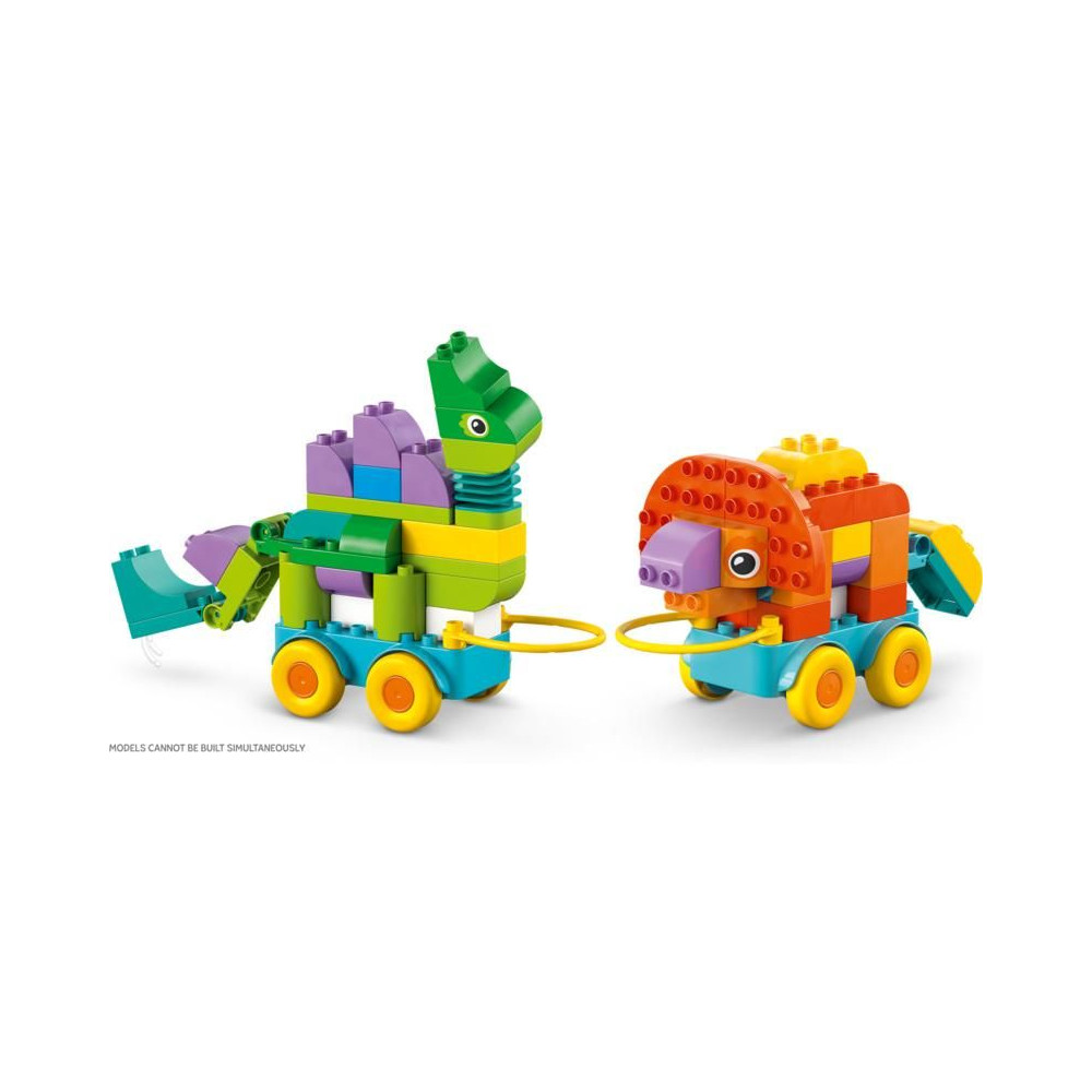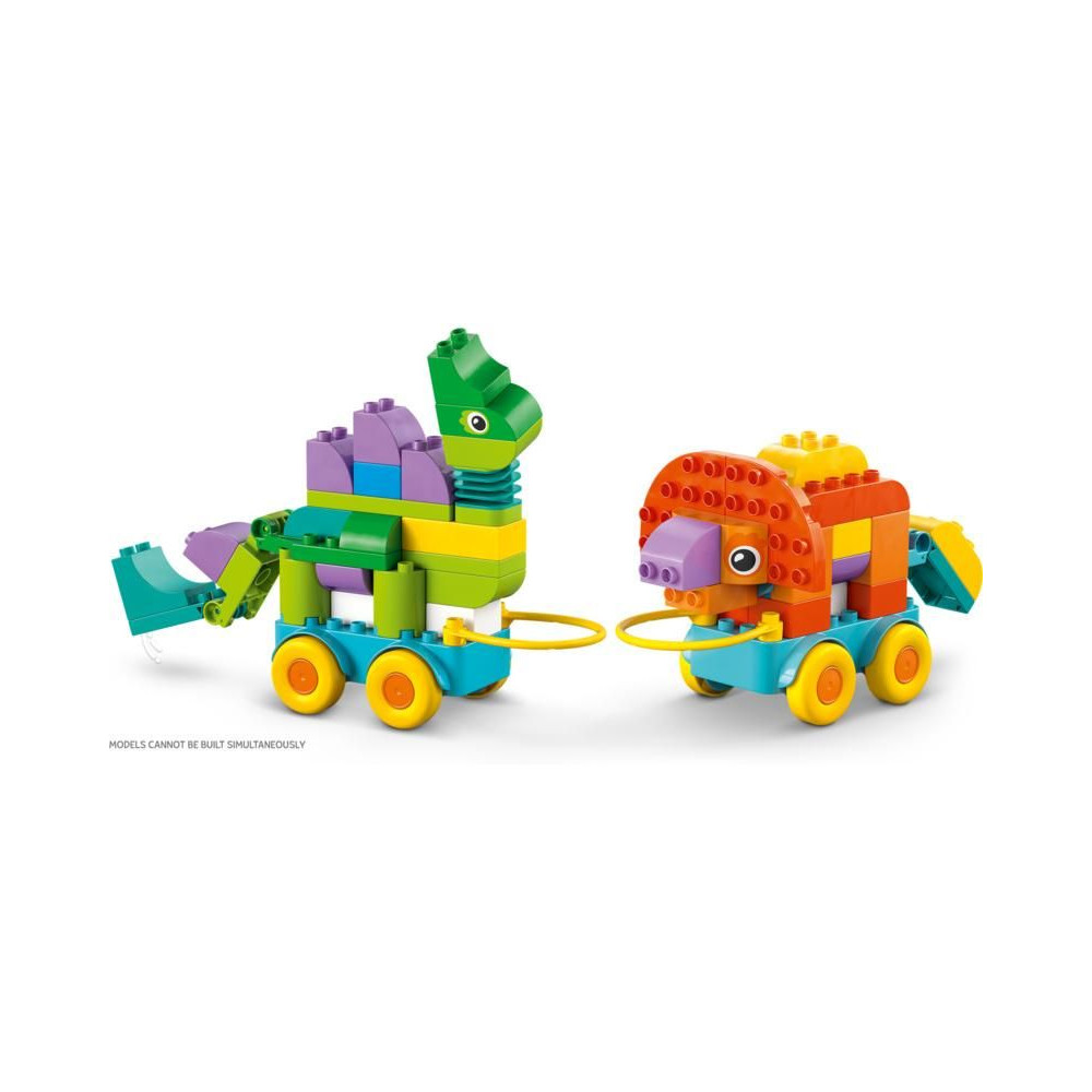 A LEGO® DUPLO® állatos készlet 108 kockája és darabja 3 különböző módon rakható össze: Diplodocus és T-rex, Triceratops és Stegosaurus vagy Pteranodon és Parasaurolophus. A gyerekek még több szórakoztató figurát alkothatnak mozgatható nyak és farok, szárnyak vagy nyitható és zárható száj hozzáadásával. A dinoszauruszok kerekes szőnyegre helyezhetők, így a készlet minden kis LEGO DUPLO járműrajongót el fog kápráztatni.