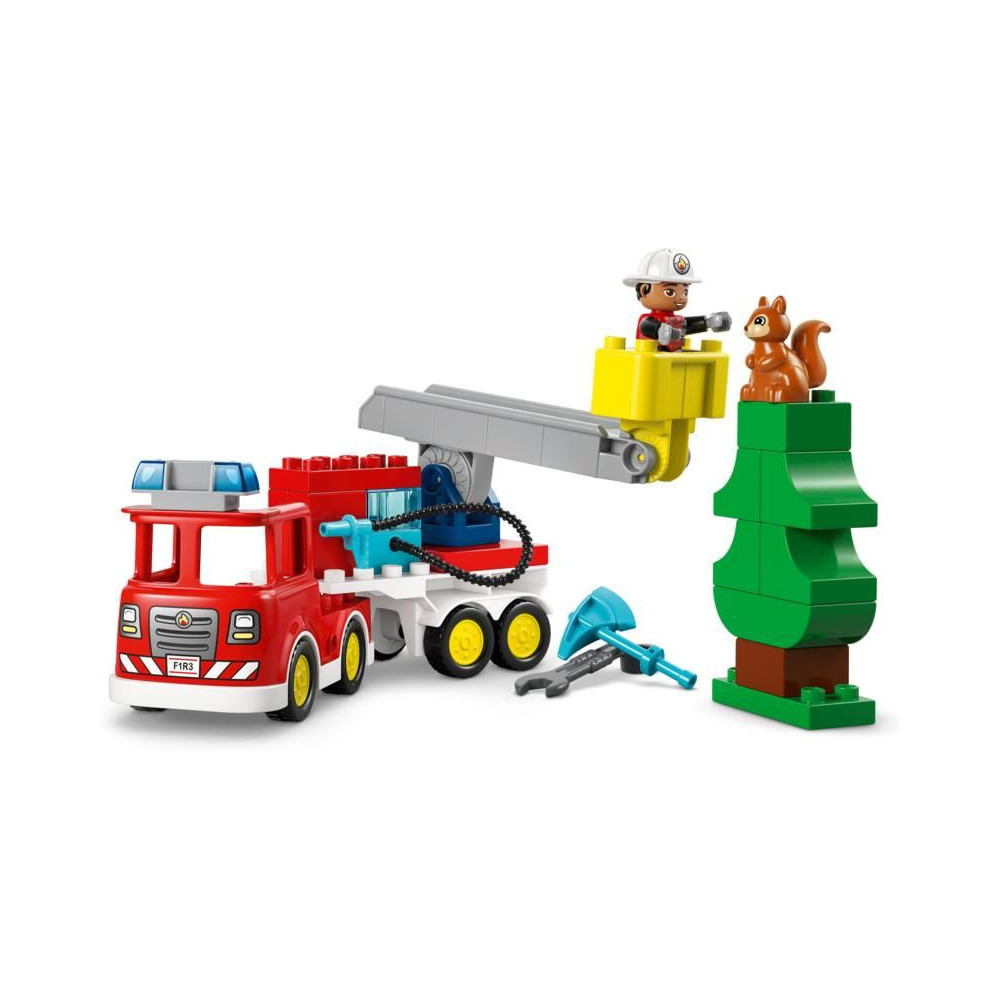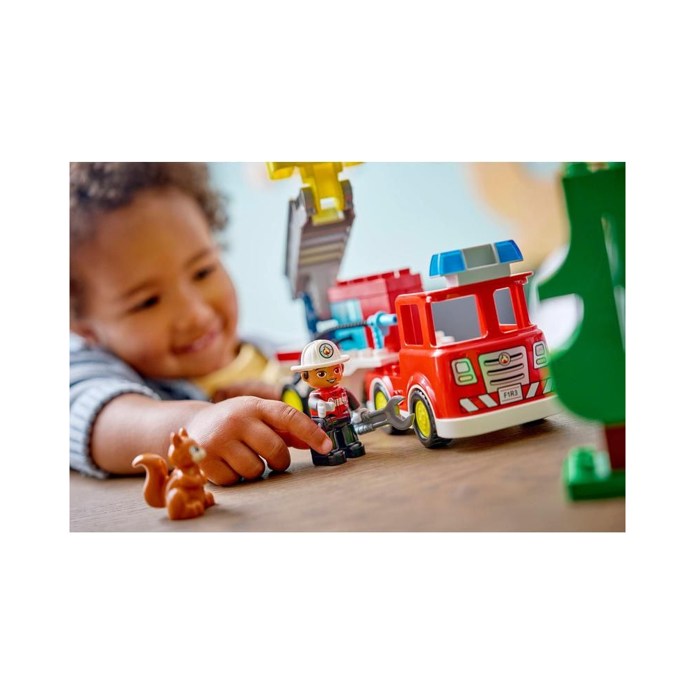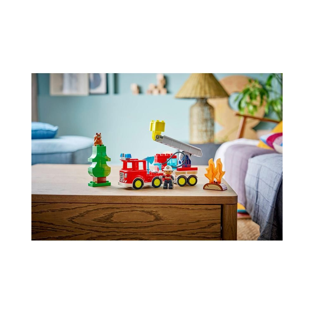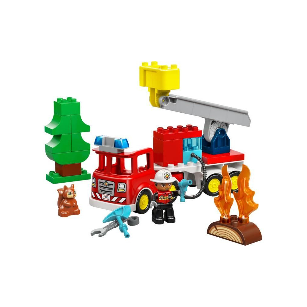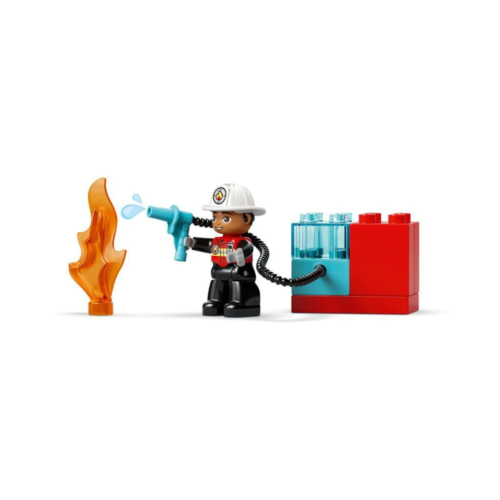 A LEGO DUPLO tűzoltóautó modell tele van szórakoztató funkciókkal, amelyek kreatív tűzoltós történetek mesélésére inspirálják a gyerekeket. Összecsukható létrával és átlátszó víztartállyal rendelkezik, amely LEGO DUPLO kockákból készült. A kezdő tűzoltók egy tömlőt csatlakoztatnak az autóhoz, és eloltják a tüzet. A kisgyermekek finommotoros készségeiket gyakorolhatják, miközben csuklós utánfutóval alakítják át a tűzoltóautót, ami megkönnyíti a kanyarok bekanyarodását. A készlet 28 alkatrészt tartalmaz.