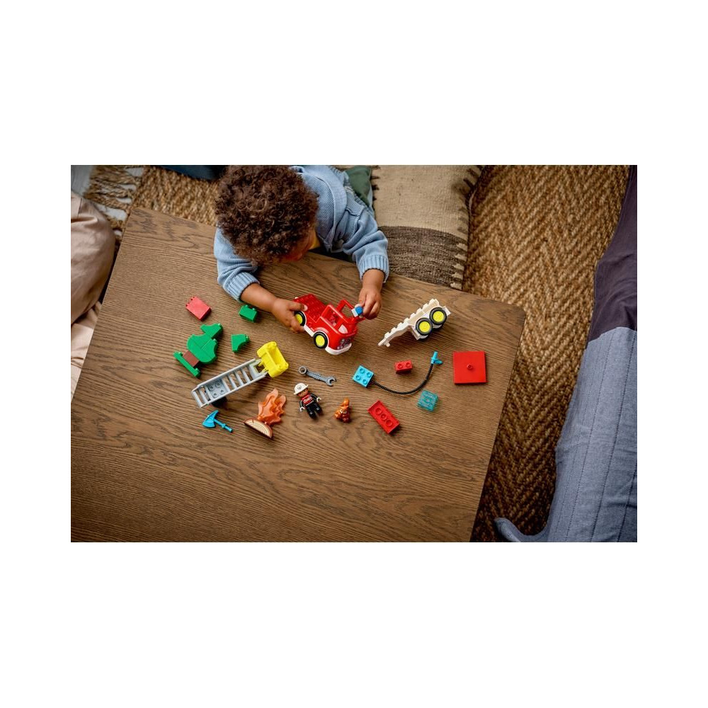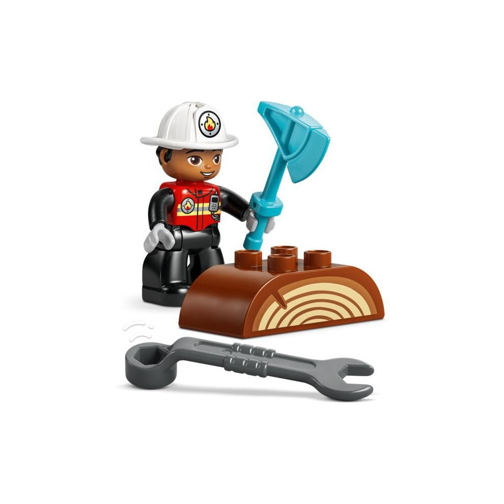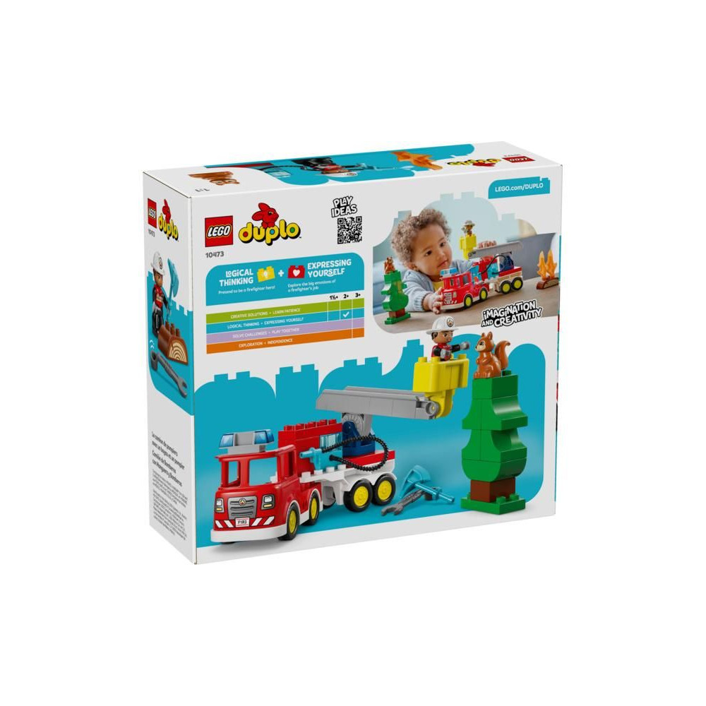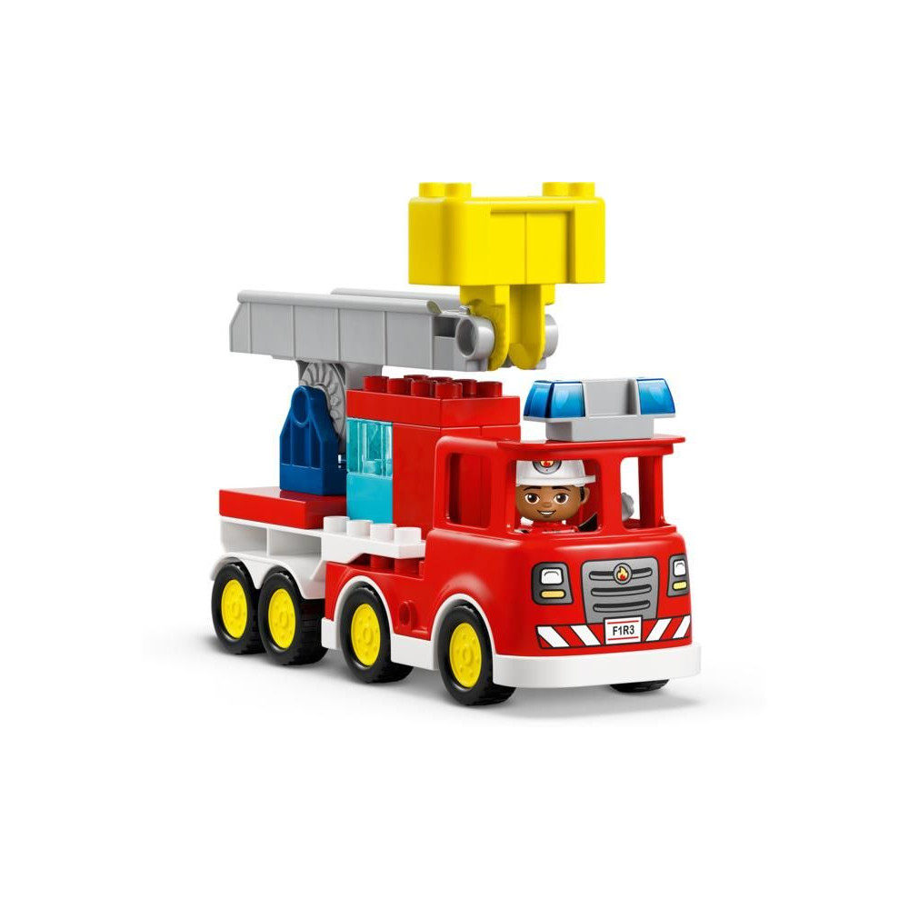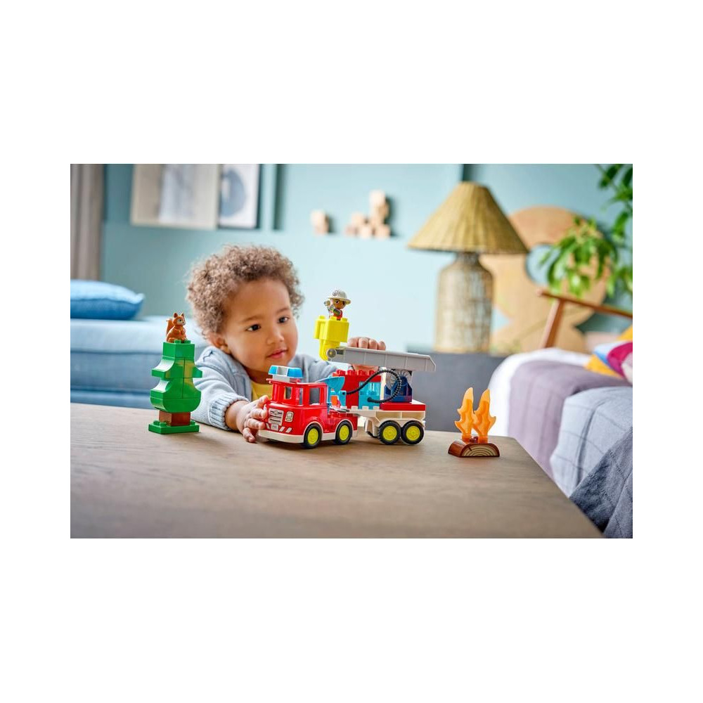 A LEGO DUPLO tűzoltóautó modell tele van szórakoztató funkciókkal, amelyek kreatív tűzoltós történetek mesélésére inspirálják a gyerekeket. Összecsukható létrával és átlátszó víztartállyal rendelkezik, amely LEGO DUPLO kockákból készült. A kezdő tűzoltók egy tömlőt csatlakoztatnak az autóhoz, és eloltják a tüzet. A kisgyermekek finommotoros készségeiket gyakorolhatják, miközben csuklós utánfutóval alakítják át a tűzoltóautót, ami megkönnyíti a kanyarok bekanyarodását. A készlet 28 alkatrészt tartalmaz.