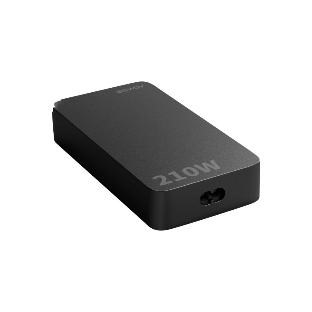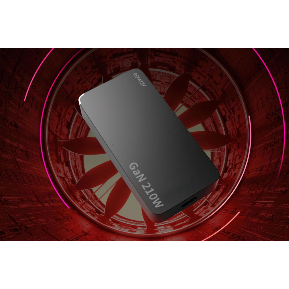Kompakt GaN gyorstöltő az Exway Flex Pro-hoz. Kimenet 50,4V, 4,17A. Töltési teljesítmény 210W.