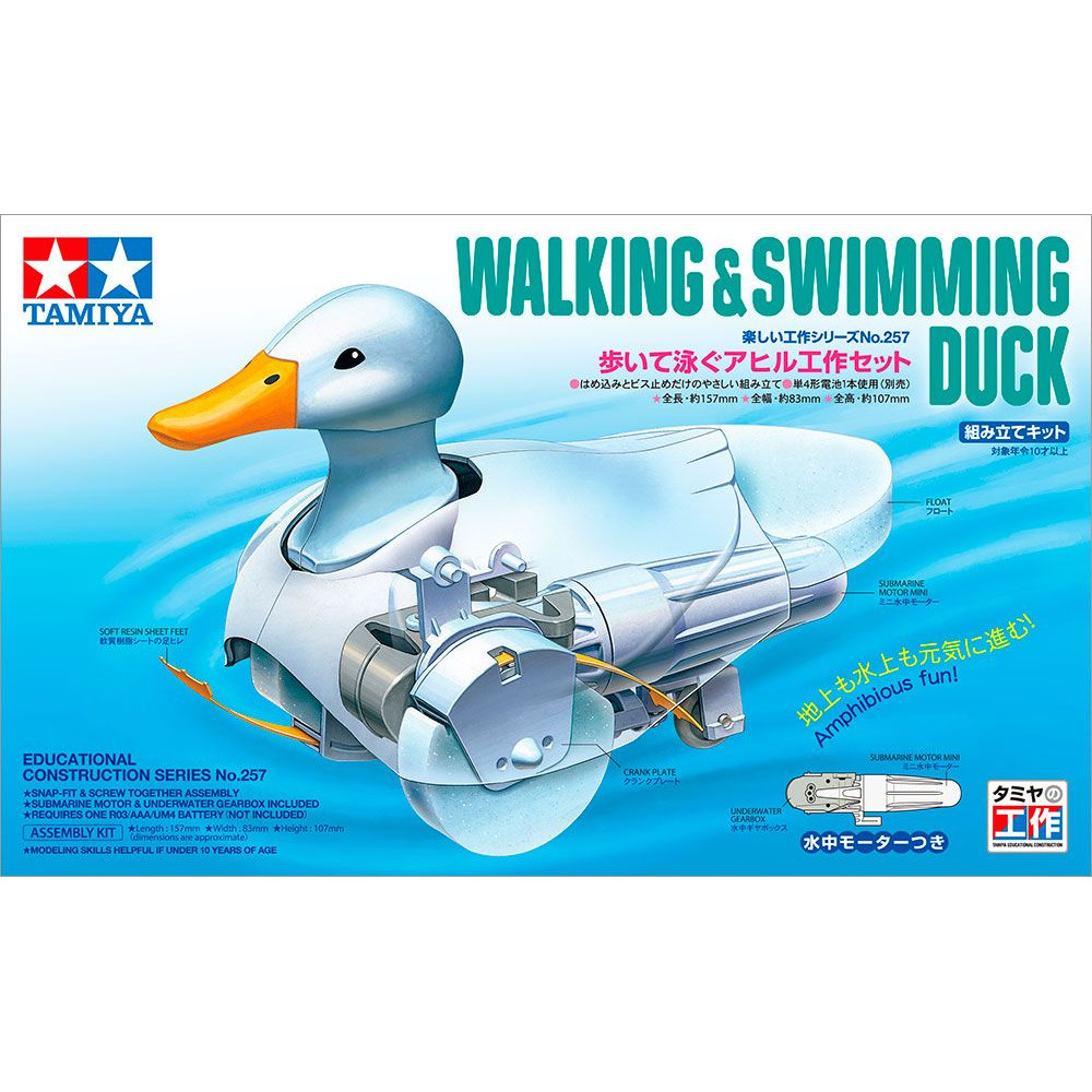 A Tamiya Walking and Swimming Duck (fehér) egy kreatív mechanikus készlet, amely játékosan mutatja be a robotika alapjait. A tiszta fehér dizájnú modell a mini motornak köszönhetően úszhat a víz felszínén és imbolyoghat szilárd felületen, miközben egyidejűleg mozgatja a fejét. A ragasztás nélküli egyszerű összeszerelés és a vízálló matricák ideális ajándékká teszik ezt a kacsát a kíváncsi fiatalok számára. Játék után ne felejtsd el alaposan letörölni a modellt és kivenni az elemet a hosszú élettartam érdekében.